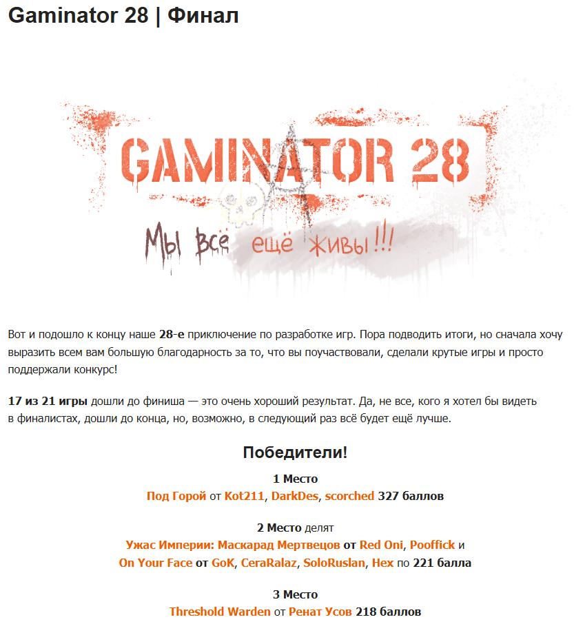 Печально читать хейт в адрес конкурса и особенно судей, осознавая, что они - самые адекватные участники раздела. Если собрать все игры, созданные ими, то вряд ли у кого-то наберётся больше. Понятное дело, что всем хотелось, чтобы оценивать игры пришёл какой-нибудь Галенкин или ХКостер. Но имеем то, что имеем.