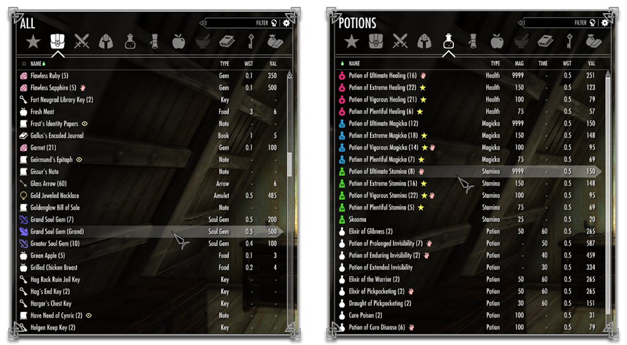 Также преимущество круглых меню в том, что площадь интерактивной области на экране зависит от числа кнопок в меню. В типичном сеточном инвентаре, если отдельная кнопка малюсенькая, то ты вынужден прицеливаться с помощью мышки в эту малюсенькую кнопку даже если она у тебя единственная на всём экране - это сильно раздражает. А искать что-то нужное среди сотен кнопок в любом случае неудобно, так что какой-то пользы от сетки всё равно нет. В общем и целом, сеточный инвентарь замедляет взаимодействие с игрой по сравнению с более быстрым круглым меню, и это даже с учётом того, что круглое меню можно красиво анимировать, а сеточный инвентарь слишком "жёсткий" для анимаций.