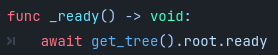 >2. Подписать детей на сигнал ready у родителя. Уже обсуждено. Да это рабочий вариант, await сохраняет порядок. Вроде должны были доку эту инфу добавить, но я не нашел. Надеюсь не поменяют поведение в версии. Но там инстансы без логики, поэтому отстрелить себе сложно будет.