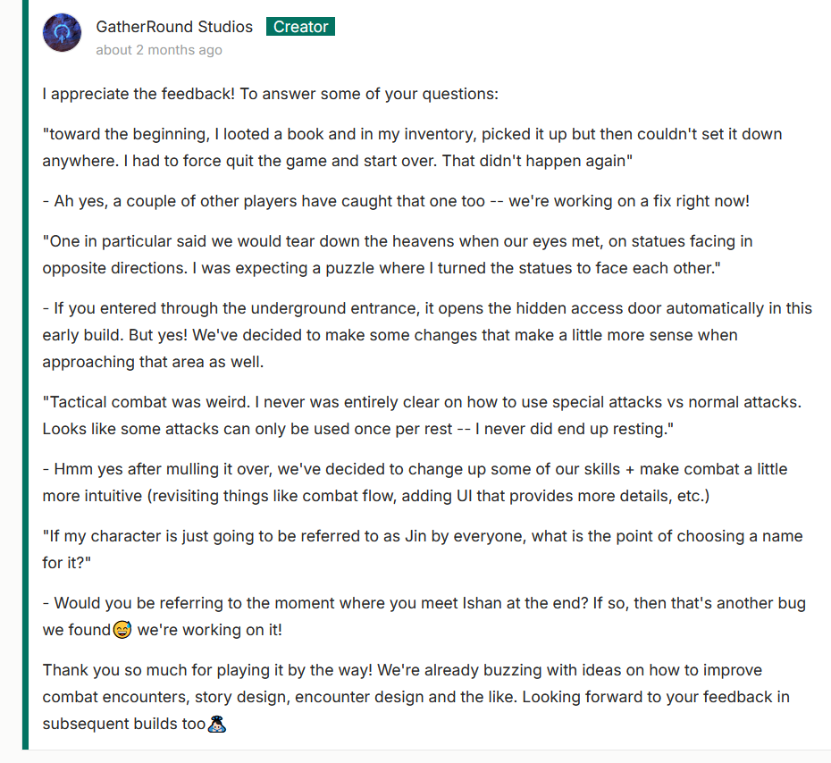 >>908964 Внезано через 2 года скама они решили перестать быть скамом и сделали билд который разослали бейкерам. Конечно там ничего не работает и это стало другой игрой (клоном ДнД), а еще арт перестали заказывать и стали клепать нейронками. Но все же. Заявлено что у них есть "50% первой зоны из пролога", что в общем то нихуя, учитывая что они планировали к концу 2024 выпустить готовую игру, а они находятся только в начале. Никаких видосов или скринов они не показали, но кто-то обсуждает же в комментах. Хотя там много ответов что ключик не емейл не пришел. Но считать что они сами себе строчат комменты, это уже будет какой то конспирологической шизой. Возможно они решили найти себе инвесторов или продать студию кому-то, а для этого накидать прототип с нейроартом.