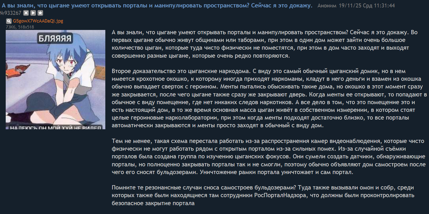 >>605406 (OP) > 0) Название игры Цыганпортал > 1) Движок > 2) Жанр > 3) Сингла/Мультиплеер > 4) Краткий лор А вы знали, что цыгане умеют открывать порталы и манипулировать пространством? Сейчас я это докажу. Во первых цыгане обычно живут общинами или таборами, при этом в один дом может зайти очень большое количество цыган, которые туда чисто физически не поместятся, при этом в дом часто заходят и выходят совершенно разные цыгане, которые очень редко повторяются.