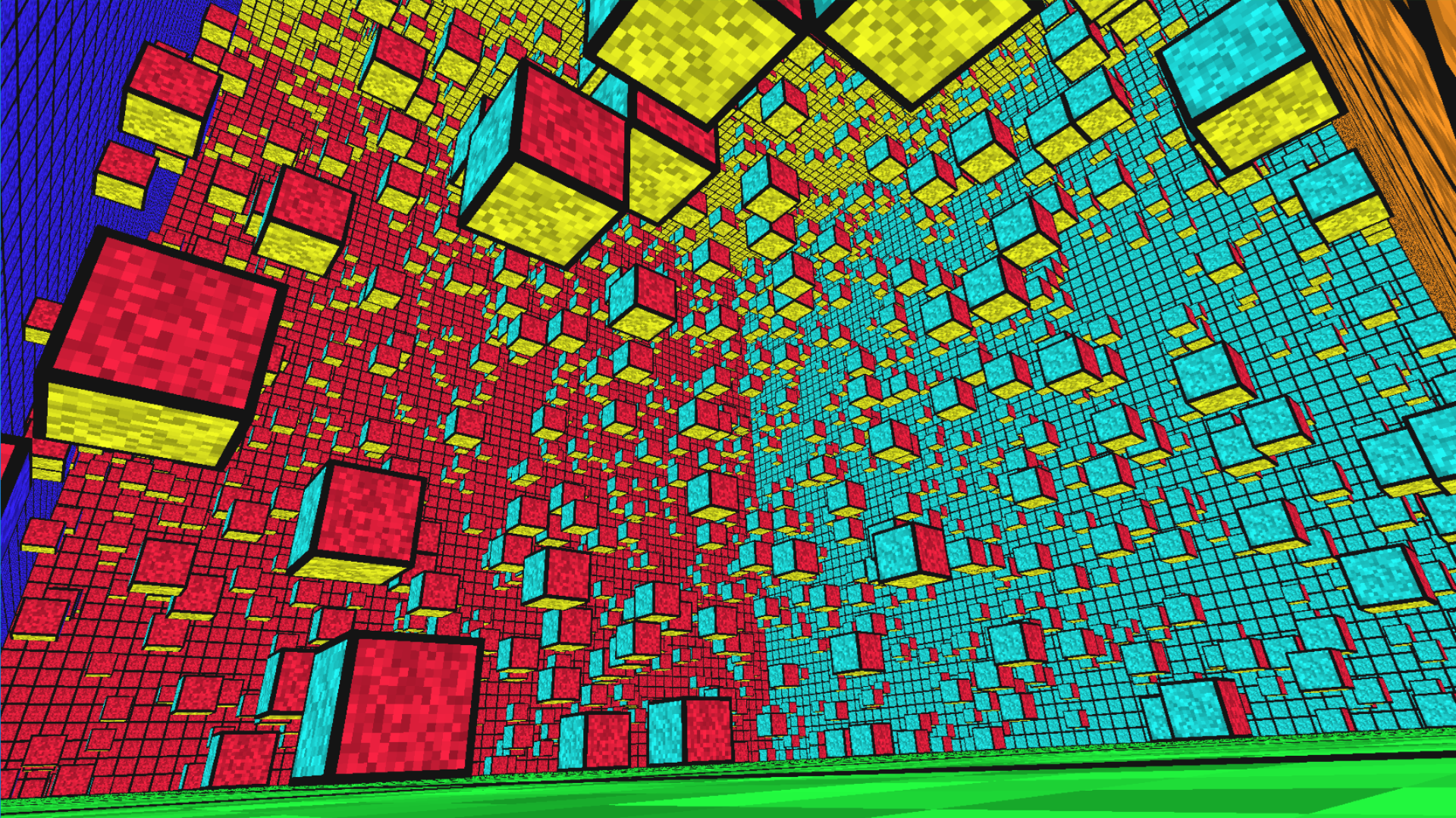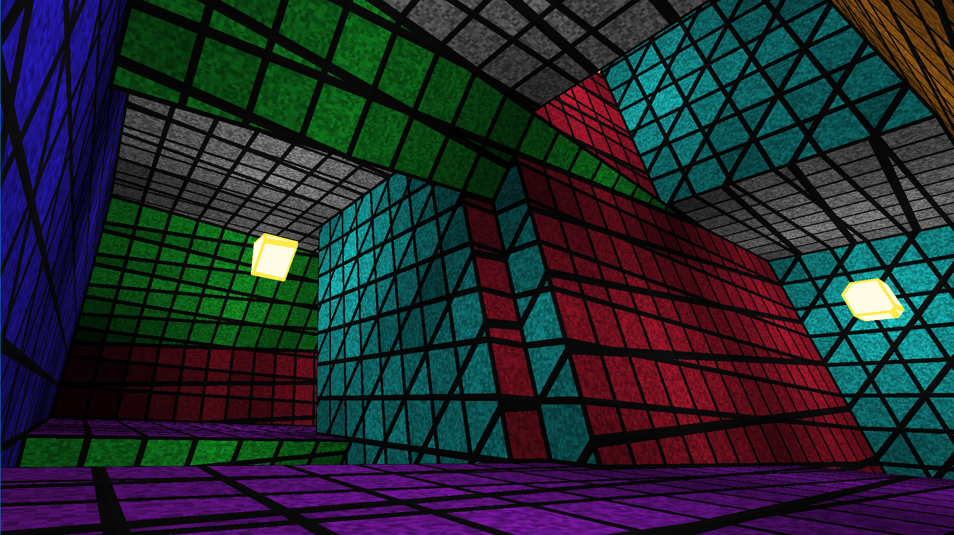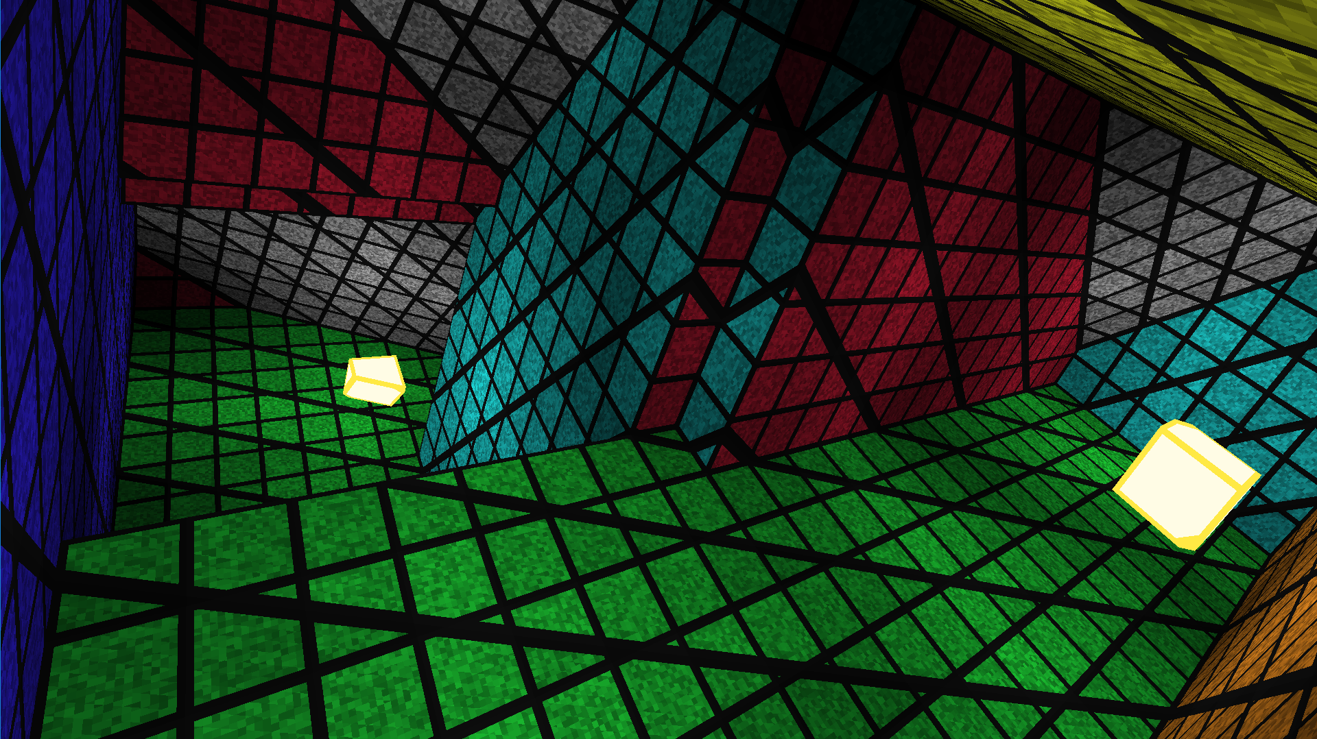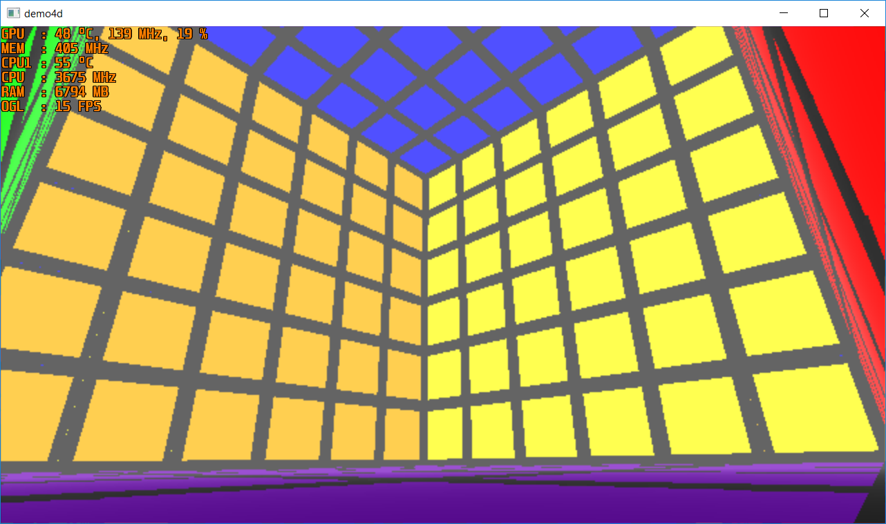 Алсо, сегодня полдня пробовал запилить алгоритм Брезенхэма для определения блоков, через которые проходит луч, чтобы искать пересечение только с ближайшим на пути (пока что исхожу из ограничения, что карта поделена на блоки единичного объема, которые либо содержат тессеракт, либо нет). Нихуя не получилось заставить его работать нормально, хотя на простых примерах блоки находились корректно. В итоге плюнул и за минуту ебанул максимально тупую реализацию: проход в цикле вдоль вектора направления взгляда с шагом 0.1 и проверкой на каждом шаге, принадлежит ли эта точка непустому блоку. Как ни странно, но это сработало, и с королевскими 15 фпс теперь может отображаться целая куча тессерактов (на 2 и 3 пиках - взгляд изнутри комнаты 8х8х8х8 (оболочка из 2800 блоков). Правда теперь есть погрешность отображения краев из-за вероятности срезать угол.