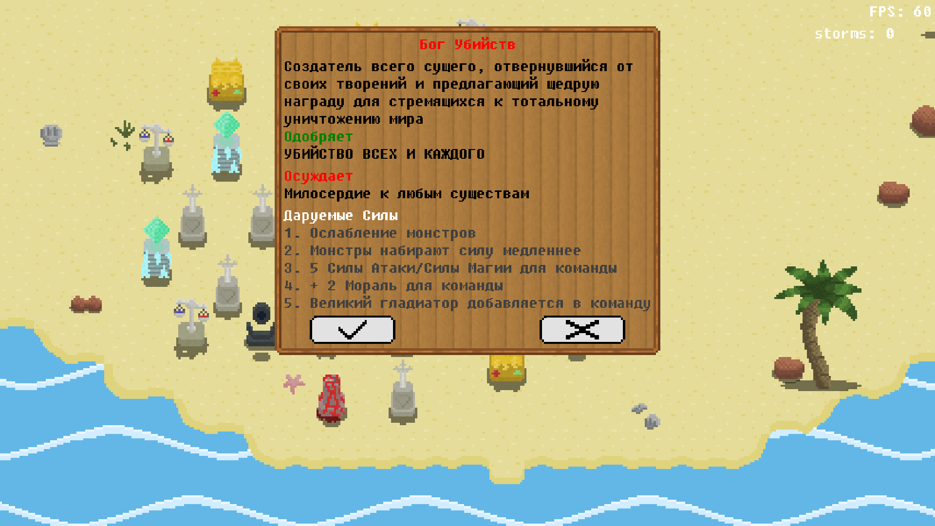 Для помощи как в бою, так и в путешествиях, игрок может начать поклоняться одному из 6 богов. Каждый предлагает свои награды, но в то же время имеет уникальные требования для увеличения расположения к себе. Конечно, многие боги достаточно своенравны и имеют список правил, нарушая которые игрок может навлечь на себя гнев, а впоследствии - кару почитаемого божества. К примеру, один из богов аналог Ru из супа предлагает игроку чем-то пожертвовать(например, способностью использовать зелья в бою, атаковать на расстоянии или одним из членов команды...), но взамен щедро одаривает за каждую принесенную жертву.