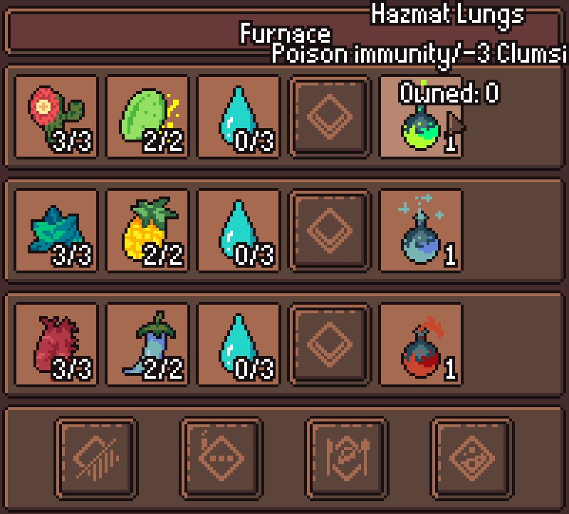 >>736471 >Это вкладка погреба, которая даёт доступ к различным станциям в погребе Вашей гостиницы, которые используются для обработки и создания предметов. Использование этих станций требует растопленной домашней печи. Каждая операция требует 3 очка топлива, которые можно восстанавливать различными видами топлива, вроде угля. Потому что они крафтятся не в печке, а в котле. >>736472 Всё там понятно.