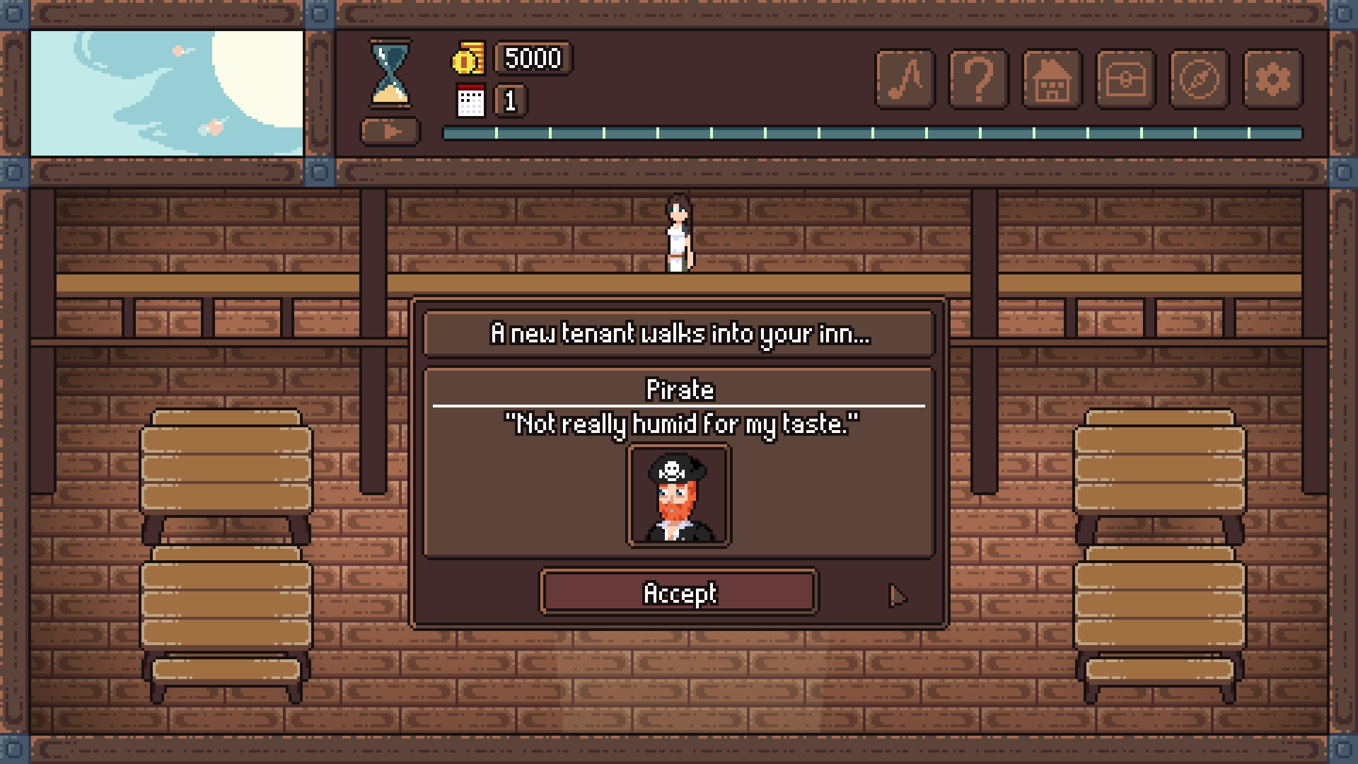 В общем тебе нужно менять концепцию. Это должна быть не гостиница, а гильдия приключенцев. А хозяйка - глава этой гильдии. Собираешь из визитёров партии, даёшь им квесты, они таскают хабар. Крафтишь из него всякое, дисэнчантишь и энчантишь, зелья варишь в котле, экипируешь их по всякому и прокачиваешь. Эдакий даркест данджен тайкун.