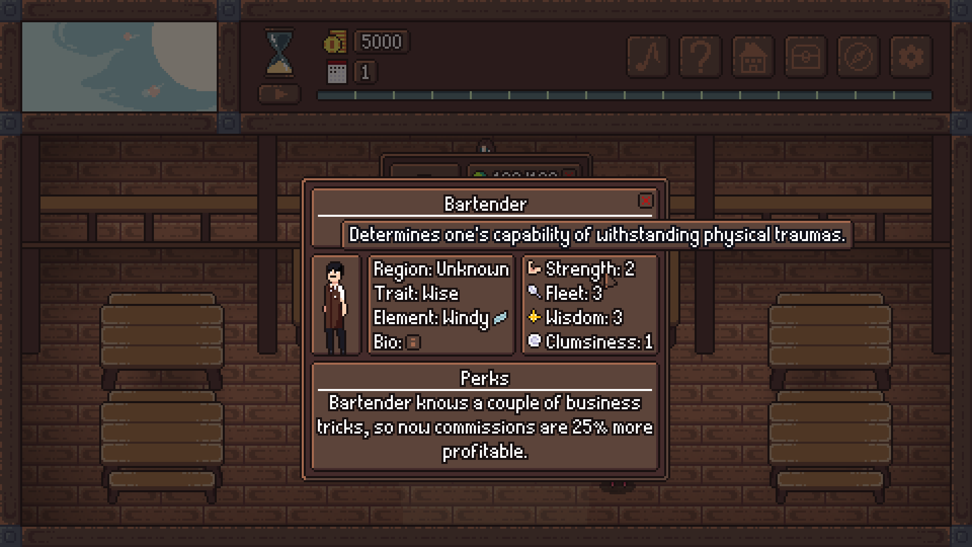 Кнопки во всплывающих окнах опять микроскопические. ДА ЧТО ЭТО ТАКОЕ!? Кнопка esc не спасает, т.к. на кнопочку "i" всё равно нужно нажимать. Параметр clumsiness очень милый. Что это? За что отвечает? Его надо прокачивать? Непонятно, но хочется поиграть. Хоть что-то позитивное. Хозяйка таверны тоже очень миленькая. Да ещё и с параметром clumsiness, который нужно качать. Да ещё элемент Windy. Жизнь налаживается, короче. Не закрываю игру с ходу, пытаюсь играть.