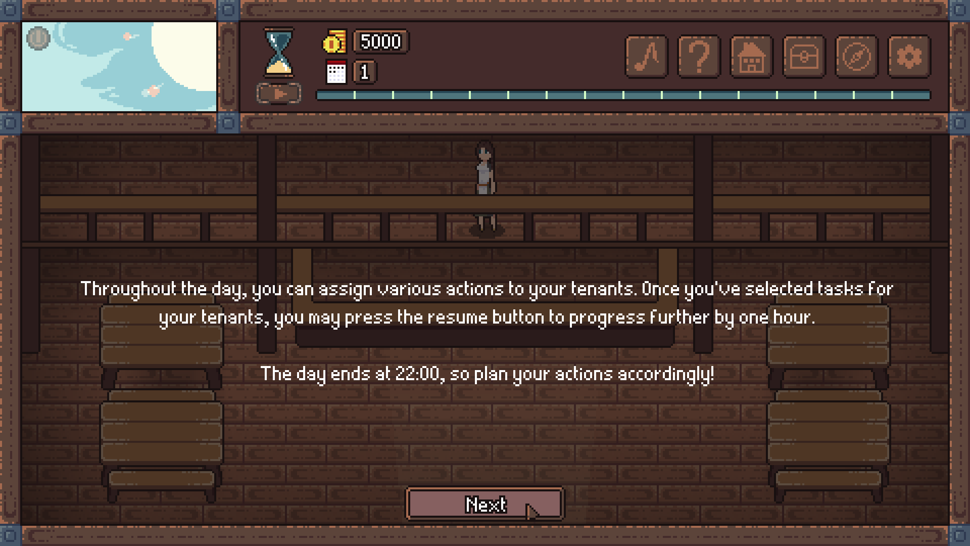 Туториал продолжается, не просто не позволяя мне действовать самостоятельно и открывать игру. Он описывает что мне нужно делать в дальнейшем сразу! Я хочу покликать куда-нибудь, посмотреть на гостиницу. Но нет. Ничего нет. В отчаянии я прощёлкиваю туториал не читая. Разберусь с этим позже.