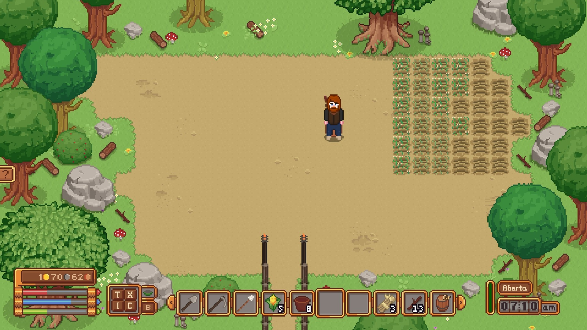 Серьёзно, что это? У тебя места на экране мало? Да нет, экран практически пустой. Тебе жадность не позволяет сделать кнопки нормального размера? Зачем ты мучаешь престарелого бумера, который не может попасть мышкой по этим крохотуськам? (а кто ещё играет в пиксельное инди?) Зачем ты ТАК акцентируешь внимание на языке? Если тебе прям непременно нужно сделать выбор языка сразу, на главном экране - ну убери ты эти флажки в уголочек, как в loop hero. А ещё лучше спрячь их в меню, у тебя всё равно шестерёнка прямо на главном экране. Догадается бумер, как язык переключать. Даже ребёнок догадается.
