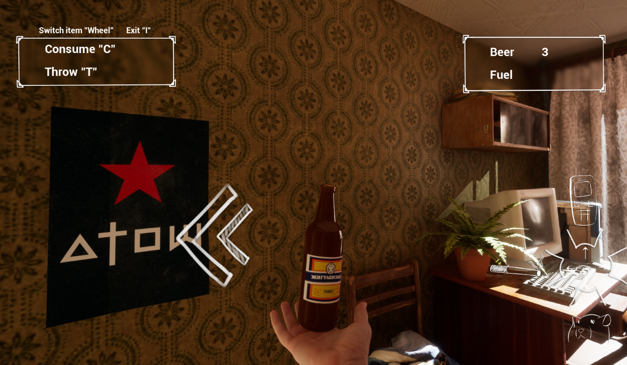 Итак, сегодня утром, ровно в запланированный срок обновились. + Добавлен функционал инвентаря ГГ! Теперь вместо простого счетчика бутылок в игре есть инвентарь в который можно складировать предметы. Это шаг к расширению разнообразия предметов в игре. + К бутылкам из под пива добавлены бутылки с пивом! Теперь можно пить пиво. Это не просто расширение разнообразия предметов в игре - это еще и небольшой но важный шаг к системе зависимостей ГГ. + Добавлены анимации покоя - дыхание ГГ и раскачивание при ходьбе. + Добавлен интерактивный холодильник. + Добавлена вода в туалете. Теперь в ванну можно включить воду. + Добавлен свет в квартире. Теперь можно включать и выключать его в комнатах. + Исправлена анимация подтягивания на турнике. + Улучшены частицы мочи.