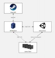 3 основных компонента: клиент, апи бек и игровой сервак. Апи бек - по сути своего рода прокси между игрой и стимом. Таким образом, как я писал ранее, удобно разрабатывать и дебажить чтобы не ебаться со стимовским апи на старте. Игровой сервер - сам сервак, на котором будут наводить суету мои 3д аниме тяночки. Клиент - очевидно что это.