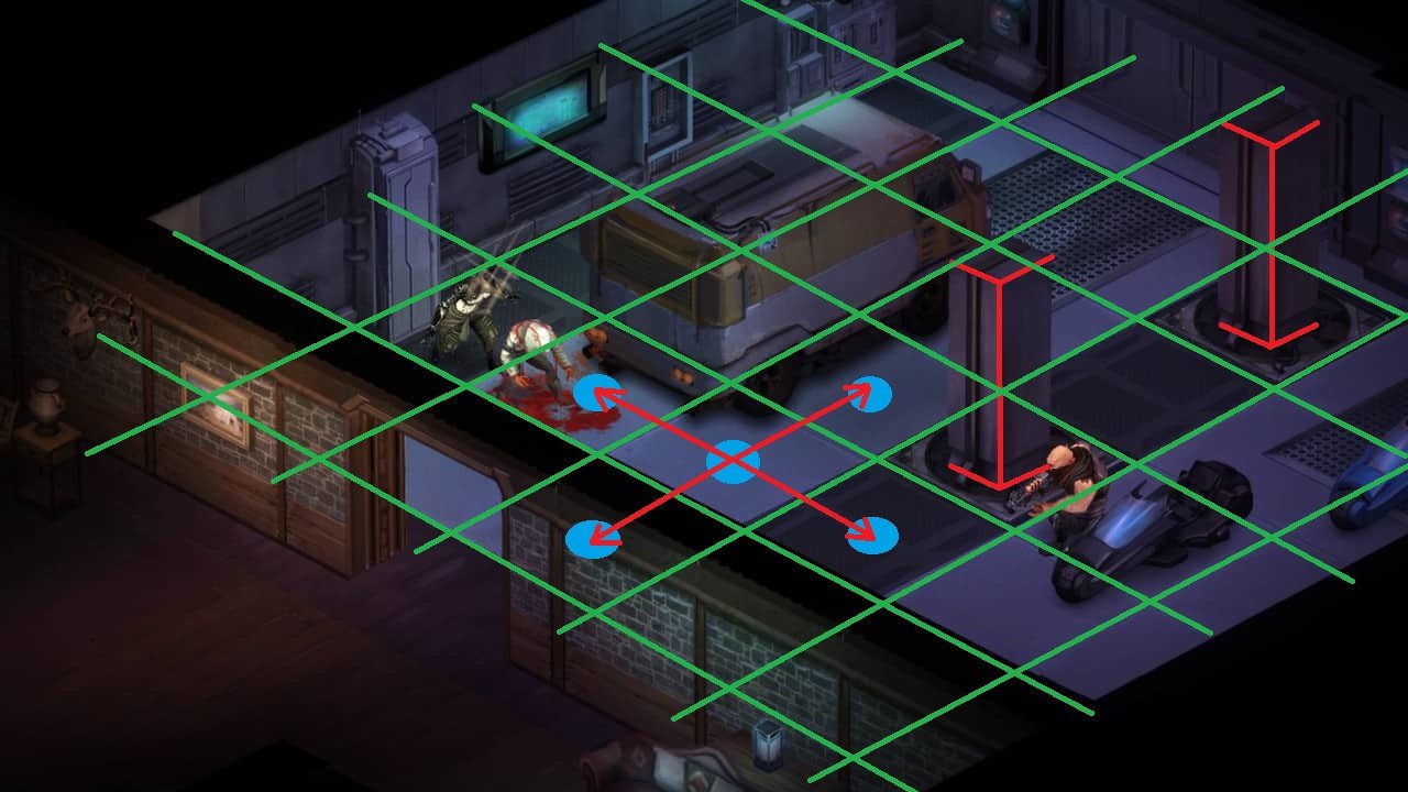 >Я не играл, но по скриншотам похоже, что все шаги одинаковой длины. Только "по диагоналям" вместо вертикали и горизонтали. Я решил использовать 3д, так что проблема с перспективой камеры не очень важна. Примерно такой угол камеры будет как на твоем скрине, но мои плитки пола будут меньше. В Шедоуране, вроде, плитка пола больше одного шага персонажа. У меня они будут индентичны.