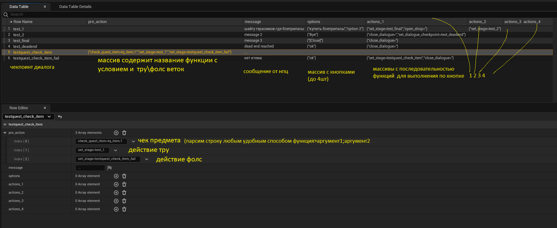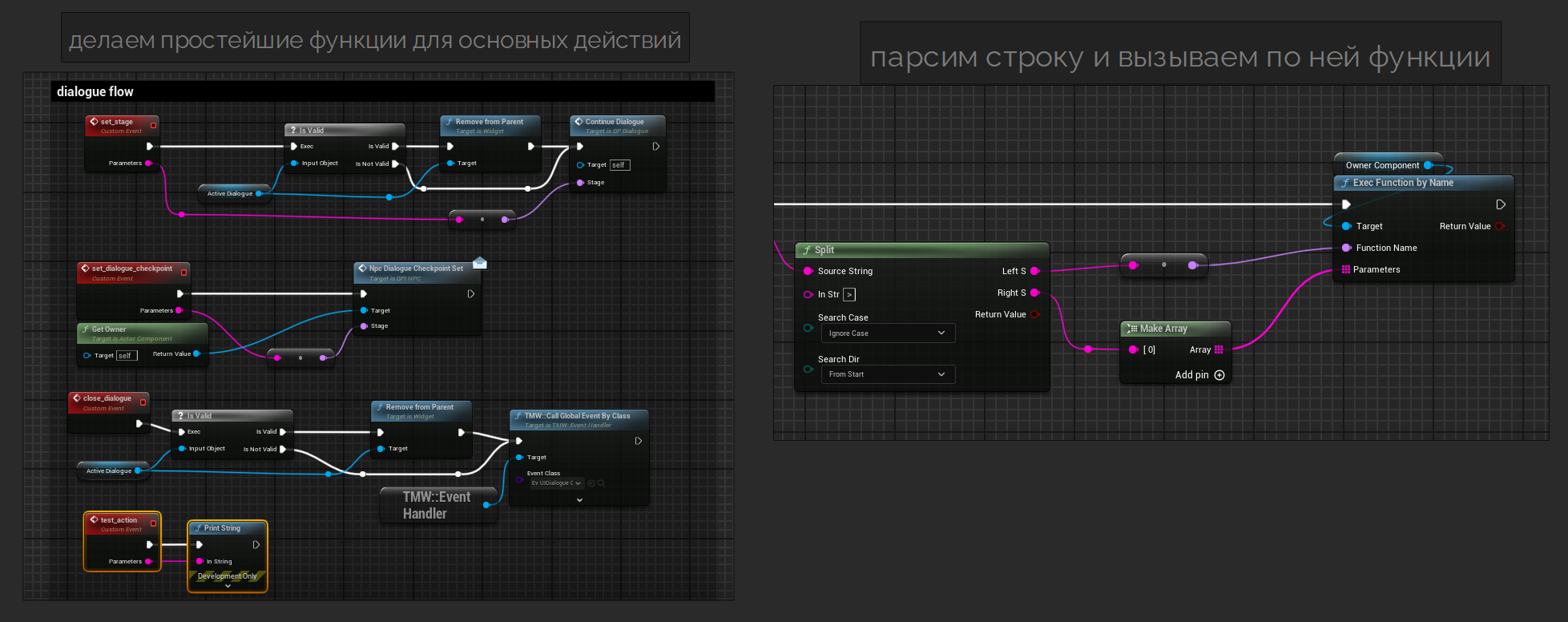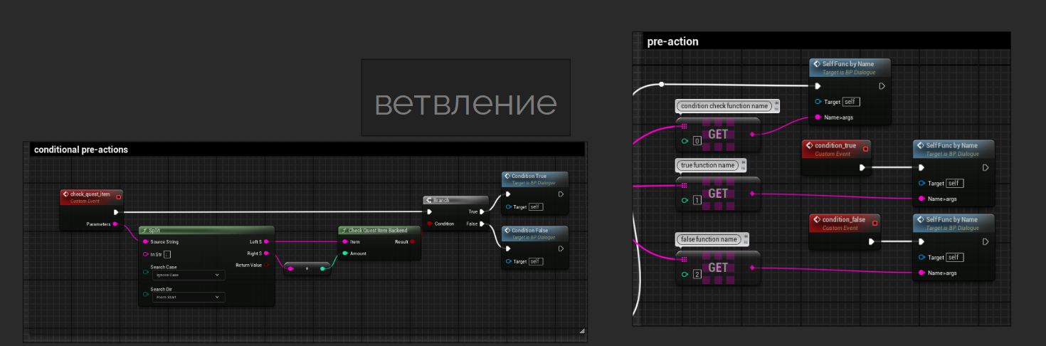 Придумал тут примитивную квесто-диалоговую систему, мож кому пригодится лол, это какое-то подобе скриптового языка основная команда которого по сути GOTO из васика, работающего на массивах строк в дататейбле. Прада я тут юзаю variable access library плагин чтоб вызывать методы по строковому имени, хуй знает можно ли это без плагина в бп сделать. Заодно можете обосрать, если не лень разбираться.