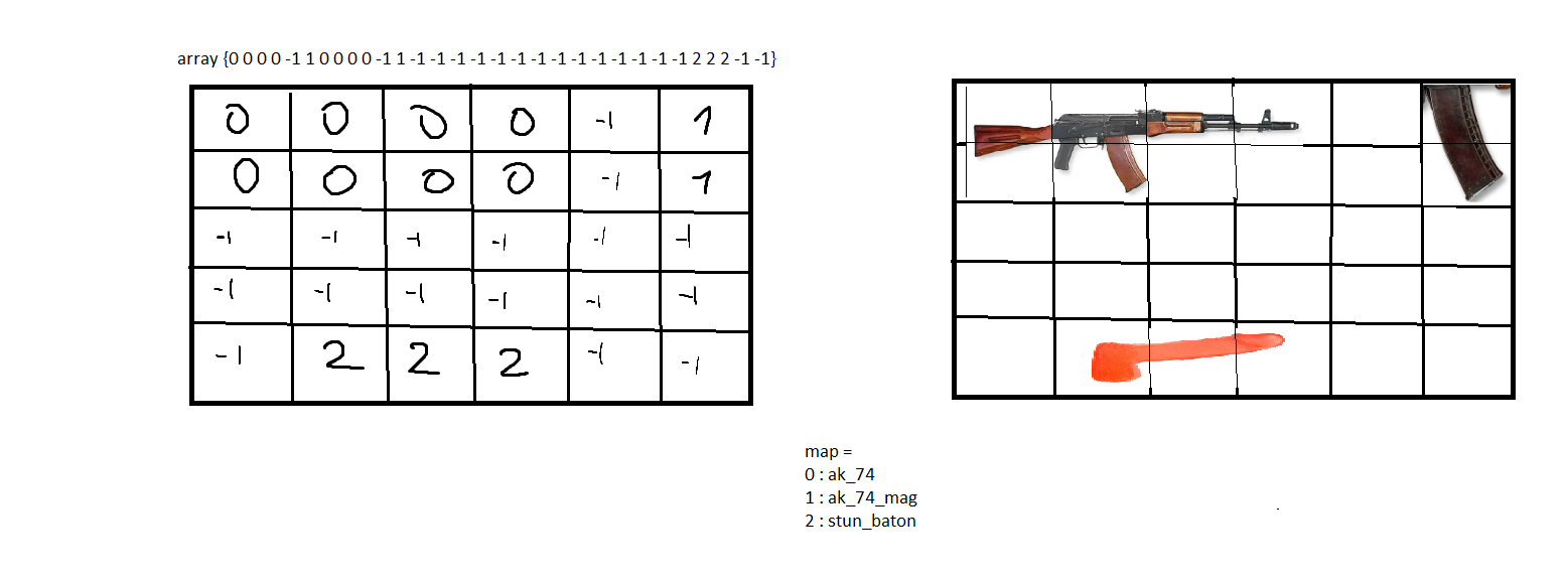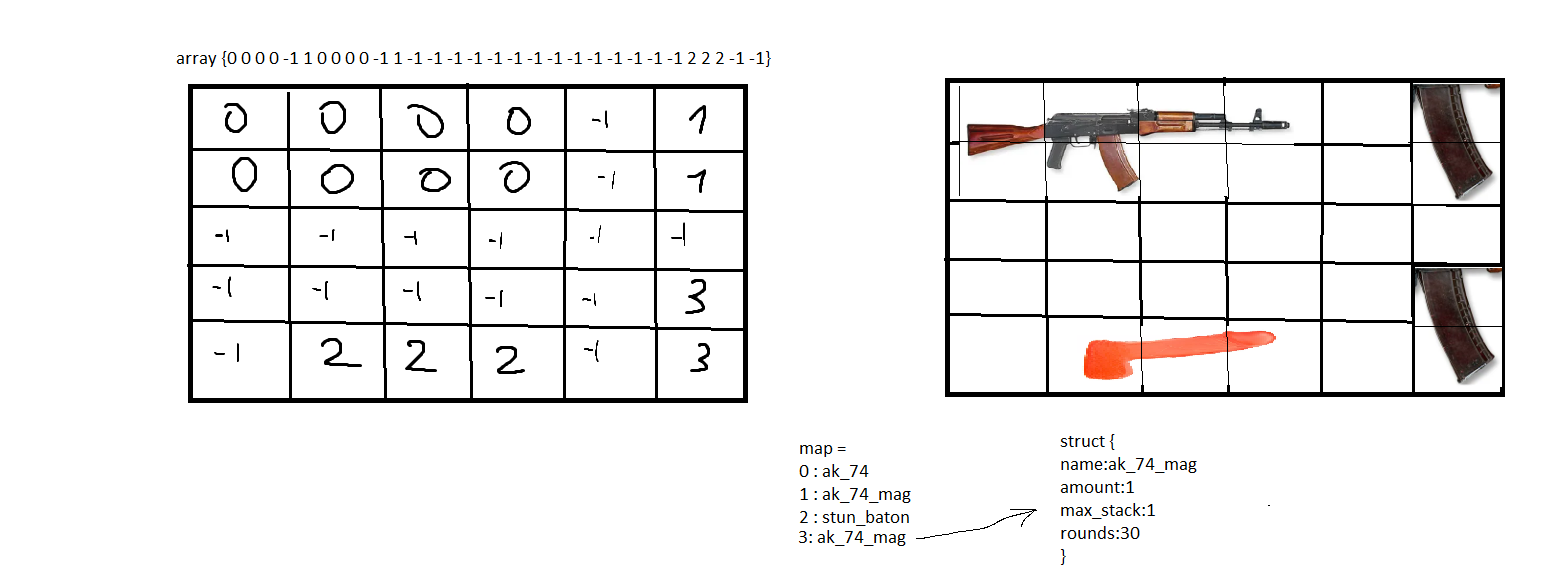 >>947251 >подумал нихуя не понял. Бля чел напрягай мозги. У тебя есть КАРТА. ОНА ТАК И НАЗЫВАЕТСЯ! Ты буквально в матрице помечаешь клеточки номером 1, а под номером 1 в карте у тебя лежит что? Магазин! Ну ладно, ты нашел второй такой магазин. Взял его, и он у тебя попал в массив уже с номером 2, но сам предмет описан структурой и в ней содержится например строковый айди, который не должен быть уникальным. Дальше ты кликаешь в клетку своего инвентаря и смотришь какая циферка там записана. Записано 2? Лезешь в свою карту, спрашиваешь че там по ключу 2 лежит. Опа нихуя, магазин!