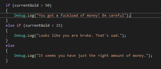 Второй вот так: if (currentGold > 50) { Debug.Log("You got a fuckload of money! Be careful"); } else if (currentGold < 15) { Debug.Log("Looks like you are broke. That's sad."); } else { Debug.Log("It seems you have just the right amount of money."); }