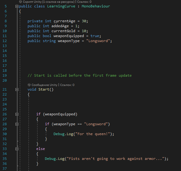 Столкнулся со странной проблемой. Есть два куска кода, которые должны выполняться в методе Start Первый выглядит вот так: if (weaponEquipped) { if (weaponType == "Longsword") { Debug.Log("For the queen!"); } } else { Debug.Log("Fists aren't going to work against armor..."); }