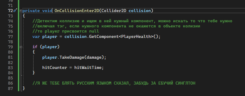 >>934461 >Мда, ну значит пиши collision.gameobject.GetComponent<PlayerHealth>(), сложно догадаться чтоль. Из-за этого первоначально код неправильно написал. Сейчас исправил - все заработало, без слоев и их отключения. Спасибо.