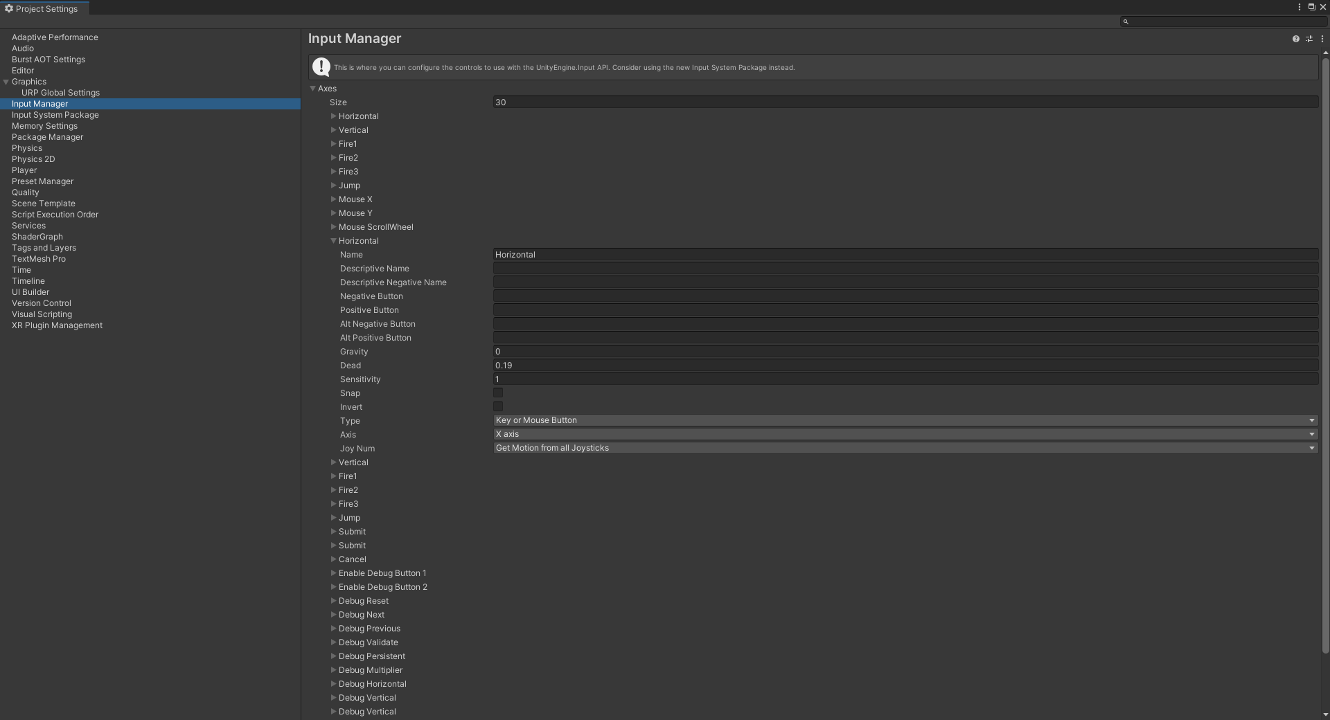 Объясните нубу, что я делаю не так. Начал проходить курс на ютубе. Повторяю все за автором, хоть он и многие моменты не объясняет, но я сам разобрался. Что я имею. Игра запускается, код ощибки мне не выдает, но персонаж не двигается. Уже в юнити ошибку выдает ArgumentException: Input Axis horizontal is not setup. Гуглил, пытался настроить, но перс не двигается. В геймдеве новичок, как и в программировании.