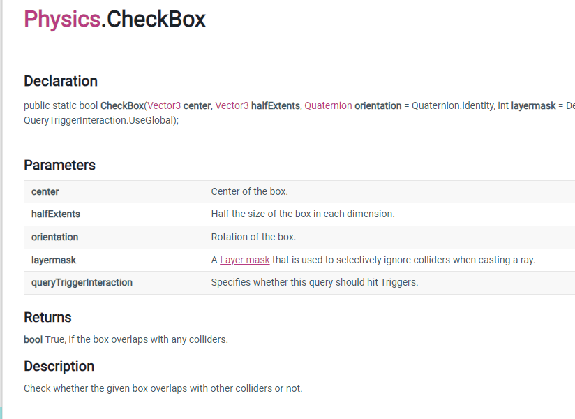>RTFM, люк. Так а что я тут узнаю из этой сухой справки по чек боксу или бокс коллайдеру? >The world space bounding volume of the collider (Read Only). ну и как я понять должен как это считается в реальности? Я был готов поспорить что это считается без учета поворота относительно глобальных координат. В свою защиту скажу, что у челов полно таких же непоняток и проблем из-за этого. Описание какой-то долбоёб на нерде писал к этим методам.