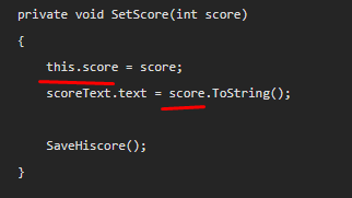 В этом же блоке SetScore в одном случае используешь this. для явного указания, в другом нет(пик1). Вообще забудь про эту даунскую практику от пизданутых программистов, которые используют одни и те же имена для принимающих переменных и внутренних. Для читабельности всяко лучше использовать что-то врод inScore в качестве принимающего аргумента, раз у тебя уже есть Score переменная.