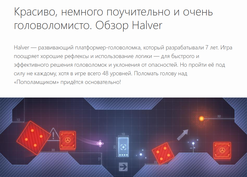 Перевод: Давненько абстрактная головоломка с геометрическими фигурами не затягивала нас до утра, но Halver это удалось без труда. Основная идея проста: вам нужно попасть на платформоподобные уровни в виде прямоугольника и на расстоянии разделить блоки пополам, открывая дополнительные возможности, такие как новые платформы и новые ступеньки, чтобы пройти дальше. Топ!