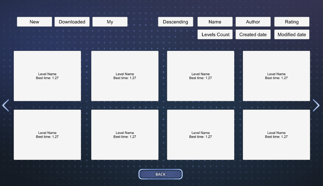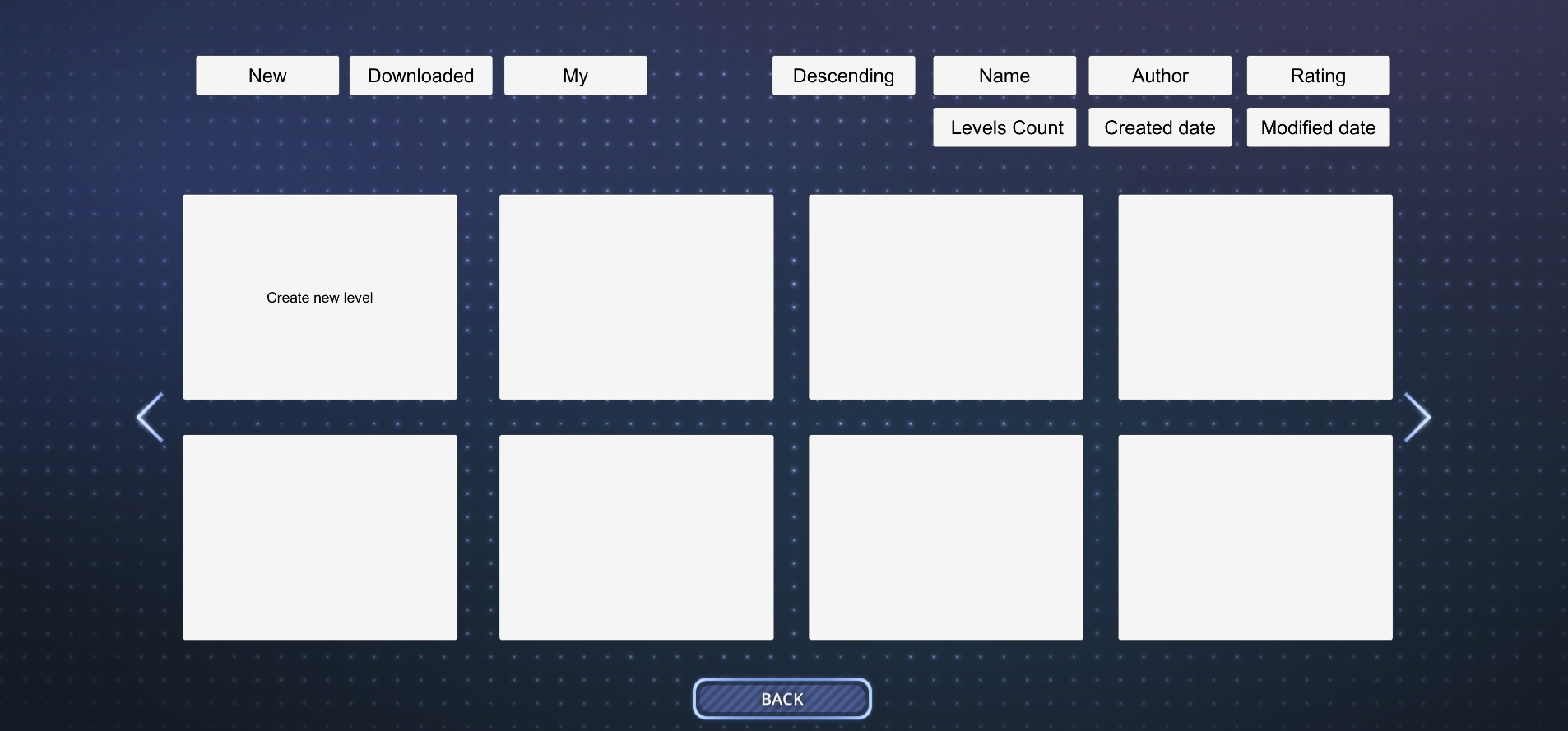>>996262 Разделил UI панели загруженных и созданных уровней, т.к. видимо визуально они будут отличаться (у созданных будут кнопки управления как минимум)