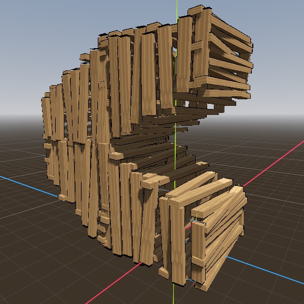 Кроме того, думал о том, что панели можно генерировать процедурно, расставляя деревянные балки в MultiMeshInstance3D (ИМХО, лучше, чем генерировать меш, если не смотреть на текстуры), что я этой ночью и накидал в сыром виде. Берём четыре точки, из них два ребра, находим середину, по шагам расставляем, поворачиваем и растягиваем одну и ту же балку с небольшой случайной вариацией - тяп-ляп панель произвольной формы готова - сам в шоке, но это проще, чем кажется. Правда, я только две оси из трёх осилил, по третьей ломается, но это не важно. Ещё непонятно что делать с коллизиями: для плоского квадрата всё просто, а что если образуется два треугольника? Да и геймплейно это никак толком не использовать без отдельного GUI - если только игра сама будет правильные формы создавать, типа тех же треугольников в случае расстановки кубов в форме "Г".