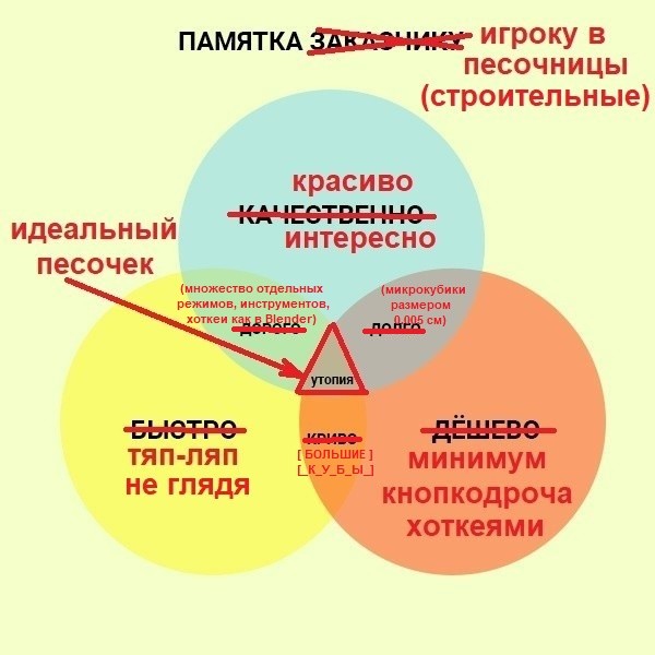 Ладно, решение очевидно - запретить все углы кроме 90. Но тогда получается, что строить из квадратов можно только "кубики", и для чего-то неровного нужны кучи отдельных блоков. Проблема отдельных блоков не только в том, что их нужно как-то смоделировать и описать правила сцепления между ними, но ещё и в том, что игроку придётся в менюшках копаться в поисках подходящих под его идею блоков (или - о, ужас! - листать колёсиком). Копание в десятках подвидов блоков противоречит изначальной задумке "тяп-ляп из говна и палок и полетели". Но вместе с тем хотелось бы чего-то привлекательного внешне, а не только летающие избушки из кубов.