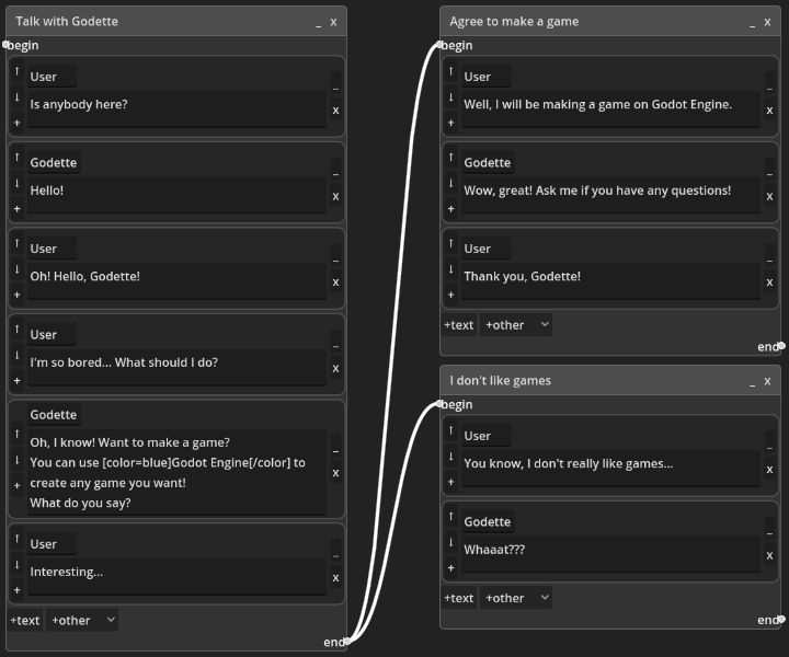 >>954757 Да. Причем в главном меню такие же кнопки и там все норм, но там они обычные. Эти создаю в пикрелейтеде вот так for i in len(answers): var _option_node = Button.new() _option_node.text = answers["text"] _option_node.theme = load("res://Scenes/UI/dialogue_button_theme.tres") _option_node.alignment = HORIZONTAL_ALIGNMENT_LEFT _vbox.add_child(_option_node) _option_node.connect("pressed", _on_answer_selected.bind(answers["next"]))