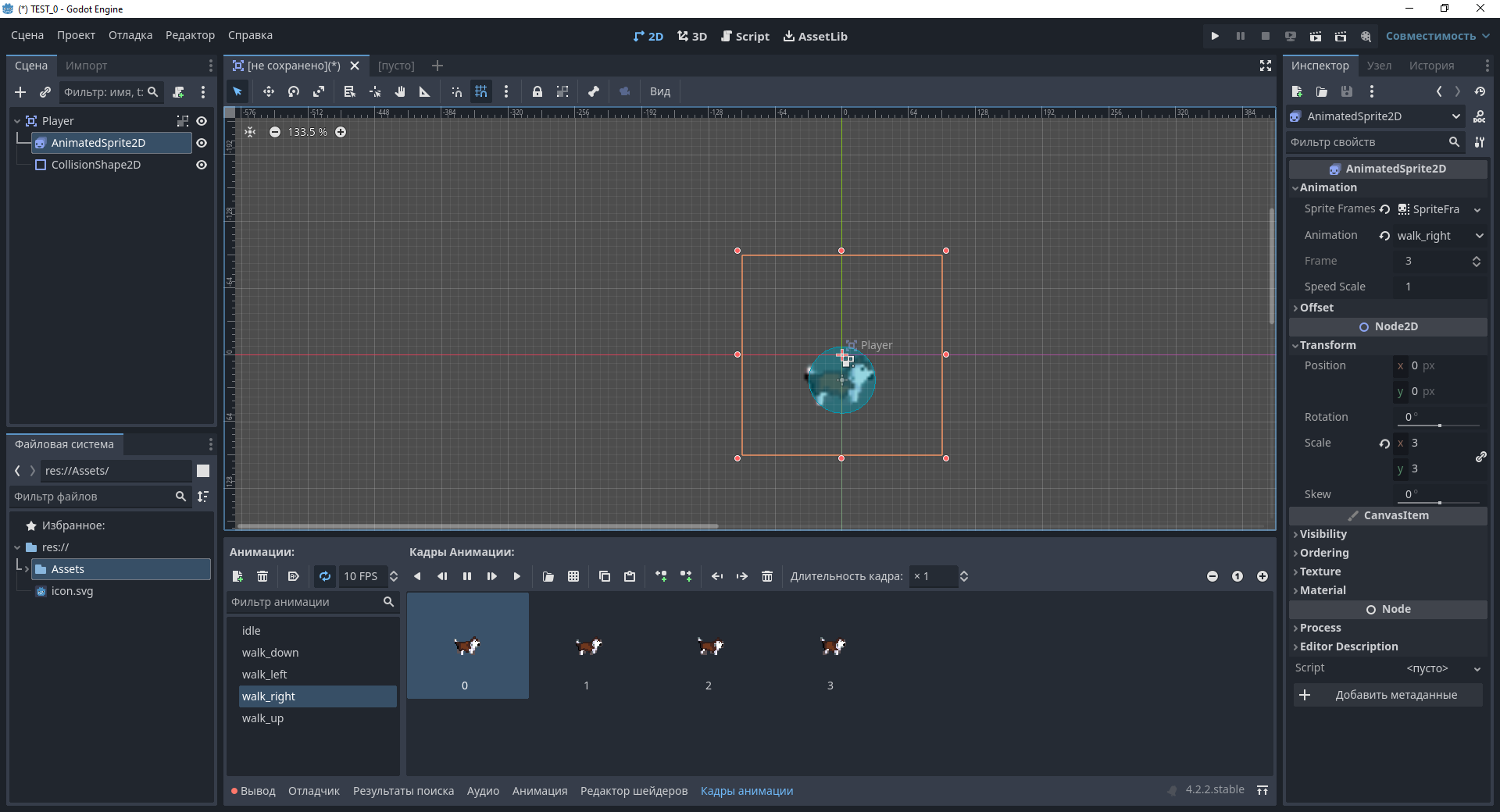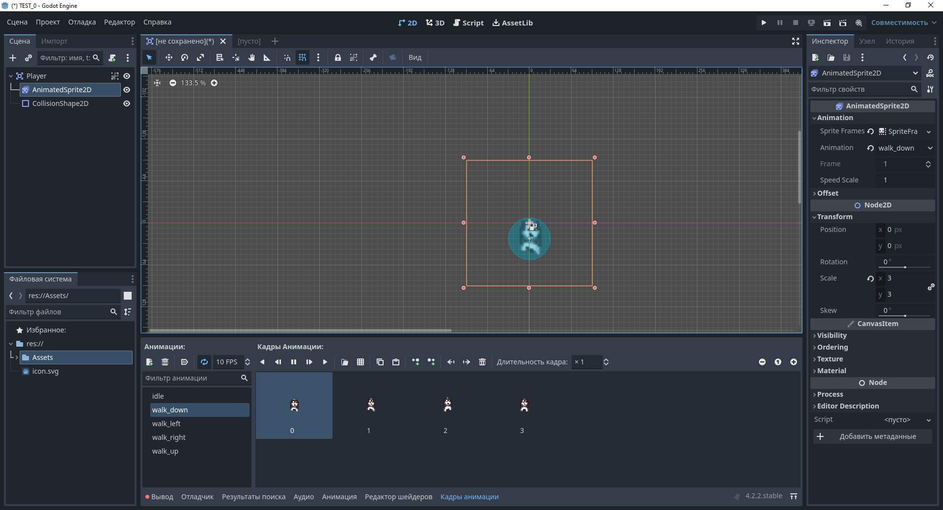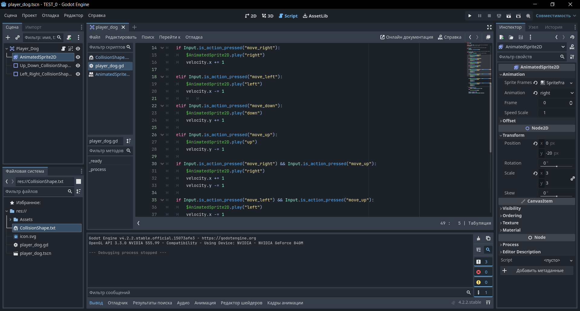 >>958308 Ты всё неправильно делаешь (неудобно). Лучше будет как-то так: >@export var speed: float = 100 # чтобы настраивать скорость из инспектора >@onready var sprite := $AnimatedSprite2D # сохраняем ссылку - так удобнее >func _process(delta): > # Получаем Vector2 со всеми четырьмя направлениями, длиной не более 1: > var input := Input.get_vector("move_left", "move_right", "move_up", "move_down") > velocity = input x speed x delta # двач съедает звёздочку (x) > if velocity.is_zero_approx(): sprite.stop() # никуда не идём > else: # если куда-то идём - анимируем: > _ # sprite.speed_scale = число x velocity.length() # если будешь делать бег (?) > _ if velocity.y < 0: sprite.play("up") > _ elif velocity.y > 0: sprite.play("down") > _ if velocity.x < 0: sprite.play("left") > _ elif velocity.x > 0: sprite.play("right")