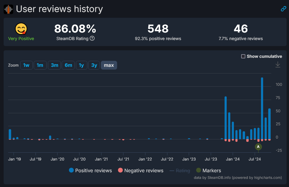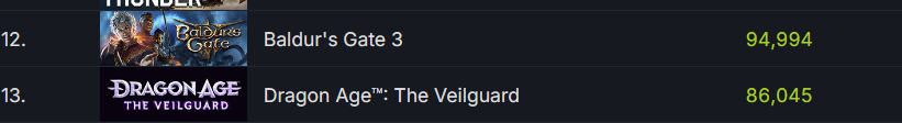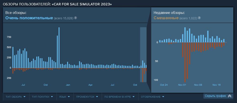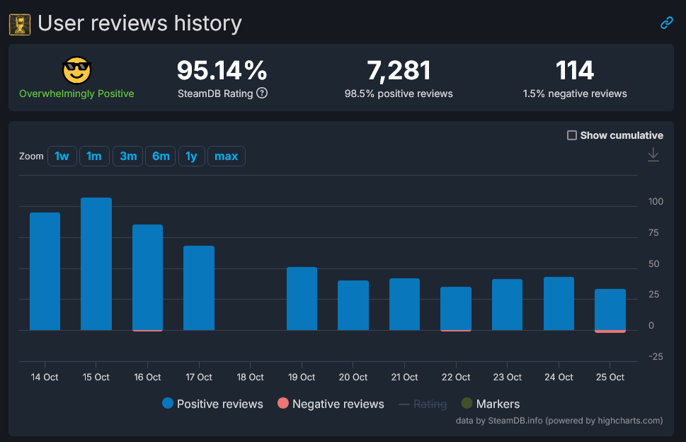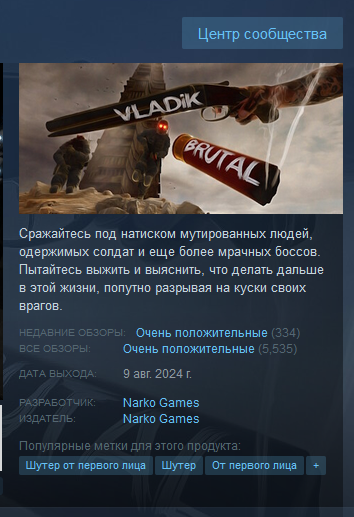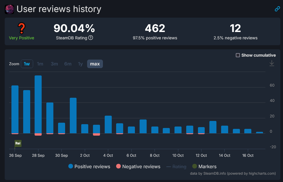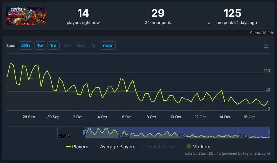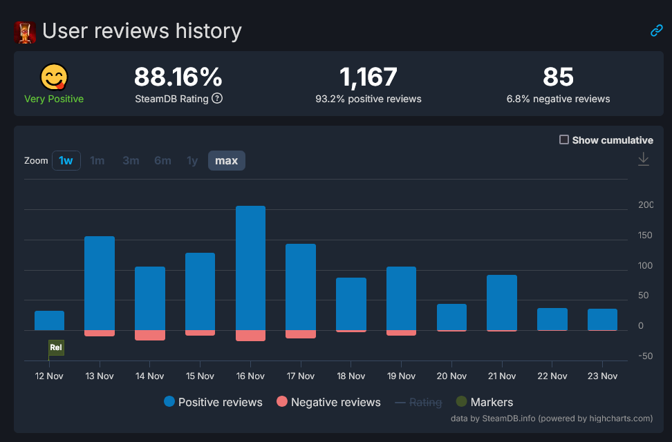 лично я думал лучше будет. что игра окажется в мировых трендингах, 1.5к+ отзывов за неделю, кокс, шлюхи, прощайте неудачники. но получилось как у зуковски - сферическая в вакууме хорошо продавшаяся игра на 300+ отзывов. я пробежал на релизе на легком, у меня клешни, когда оценка была 100% положительных на 20 отзывов, игра в целом пушечная, но коротка, о чем вскоре начали жаловаться в отзывах. что, кстати, повлияло на максимальный онлайн. и возможно на алогоритмы трендингов
