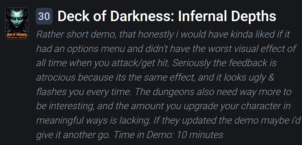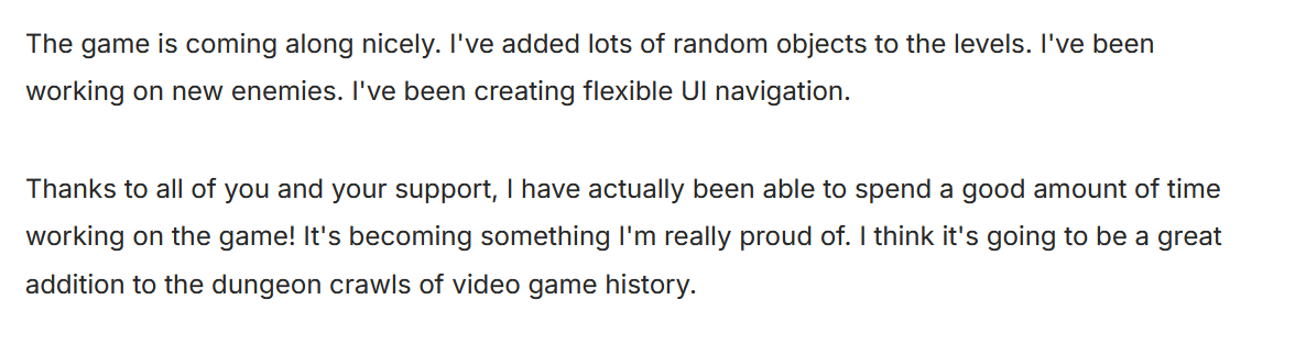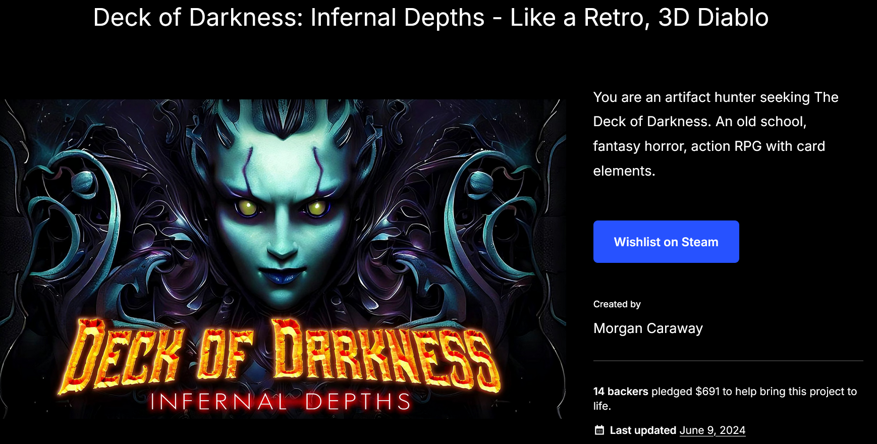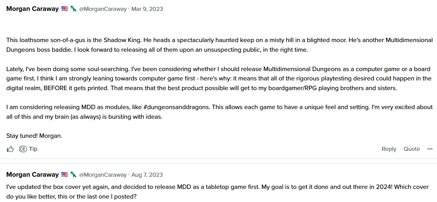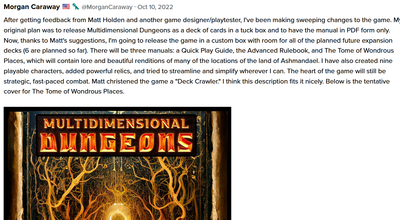 Итак в 2021 году чел начал делать настольную карточную игру https://boardgamegeek.com/thread/2582296/multidimensional-dungeons-a-cooperative-deckbuildi Выглядит черезчур заморочено чтобы кто то в нее вникал Он про нее регулярно пишет и всем похуй никто не читает. Также он выкладывает иногда арты на всякие форумы и реддит, и там тоже 1 ответ максимум. В 2022 году он заказывает тестовую печать карт, готовит кикстартер и несет показать игру каким то геймдизайнерам настольщикам. Они видимо критикуют и он решает переделать игру, упростив. При этом строятся планы на несколько допов, рулбуков и так далее. В марте 2023 он решает выпустить игру как компьютерную, в августе снова передумывает и решает сначала выпустить игру настольной. Открывает кикстартер, но в начале 2024 закрывает.