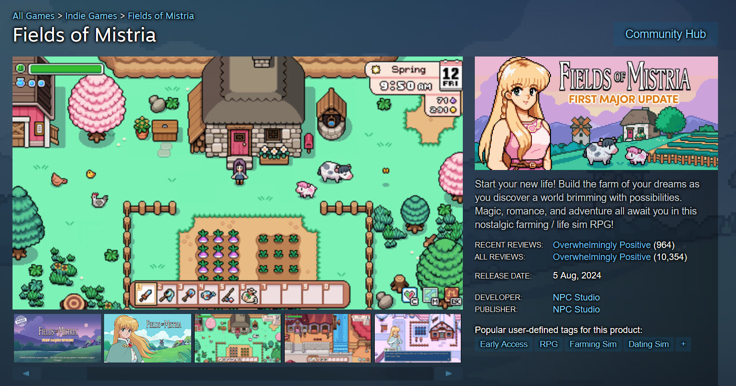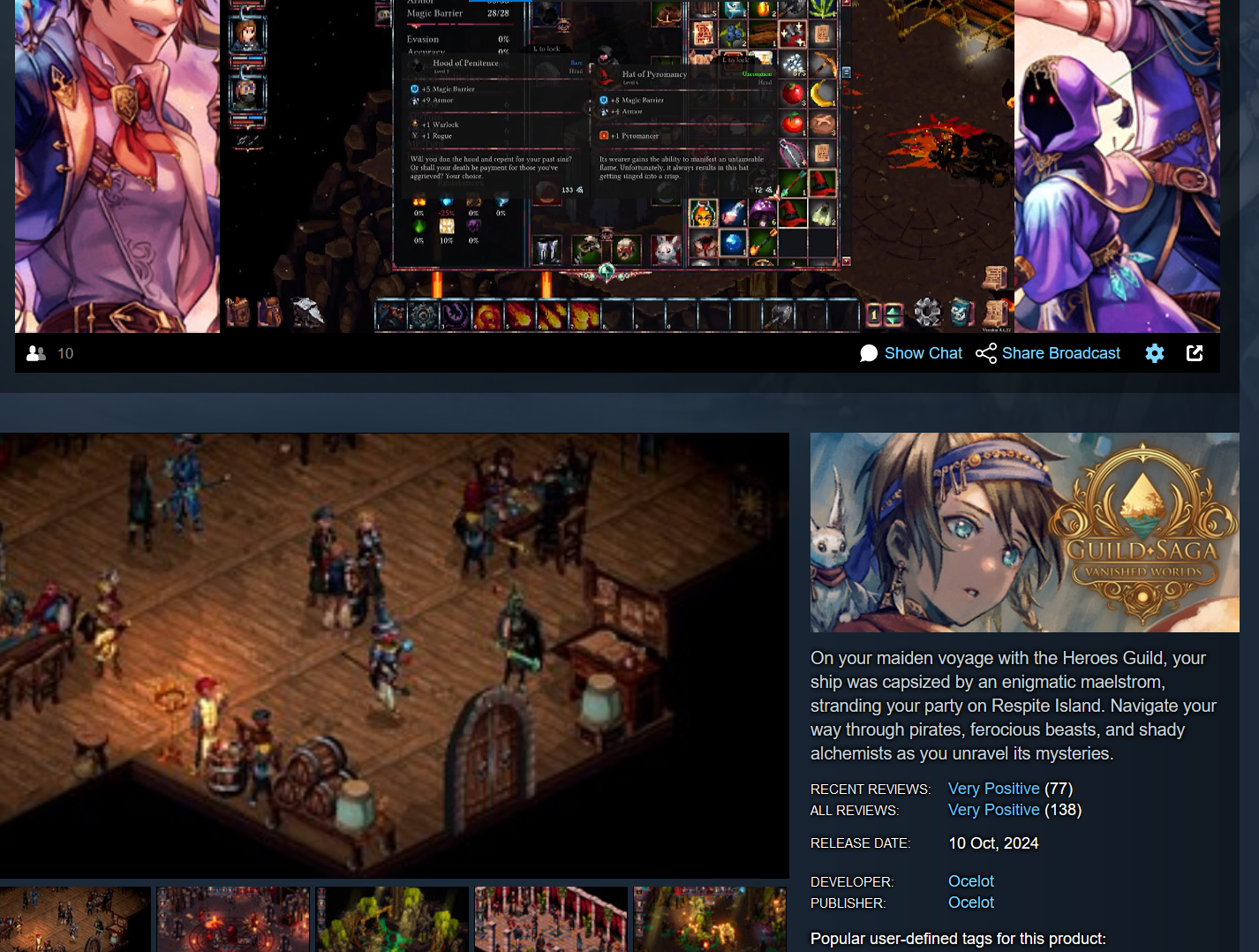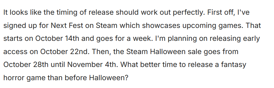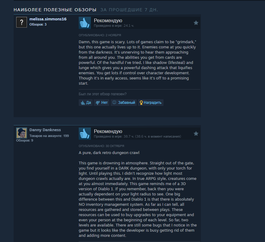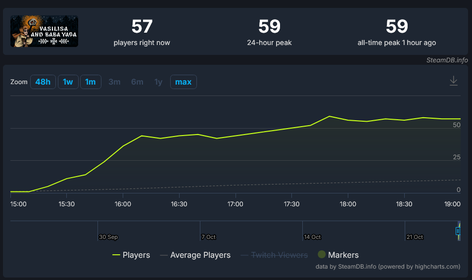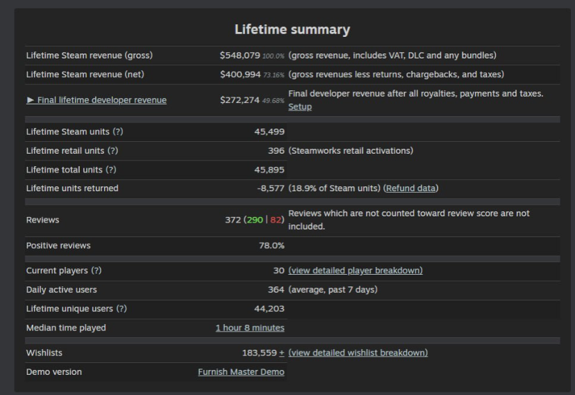 Зато игра взлетела без маркетинга: >There were no marketing campaign at all. The goal was to create a first game and check the whole development process from A to Z. We received steam page on September 6. Then Steam gave us 700 wishes for month. Then we received additional ~500 wishes during Steam Next Fest. Almost all visits are internal and provided by steam algorithms. Свежий комментарий: >It seems that getting ~750 sales with no marketing at all means that people are willing to buy the game just from a cursory look. With more focused marketing now that it’s been released, it seems growing that number wouldn’t be too hard.