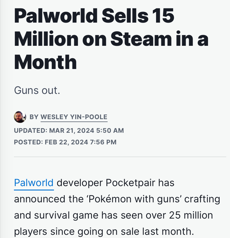>>980296 Ну да, там издатель 4к копий продал на свиче. И учитывая, что издатель такой себе и это его самый большой успех, кроме нерда (который давным давно был), то издателю повезло с айронмитом ещё. Интересно какие там условия у них