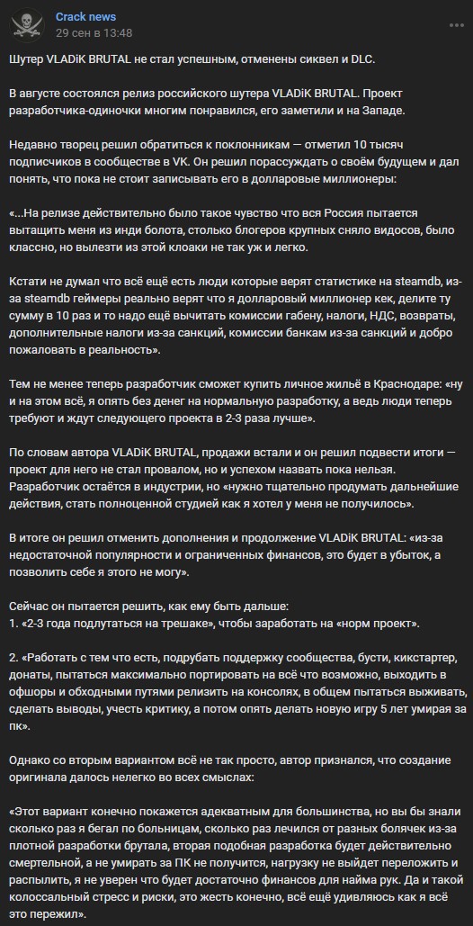 >Зато игра взлетела без маркетинга: А она разве взлетела? У нашего Ворюши с каким-нибудь Miceguard примерно такие же продажи были первый месяц. Это дефолтные продажи нонейм-игры которую покупают только редкие любители жанра и коллекционеры. Для взлета надо хотя бы 10к копий за месяц продать.