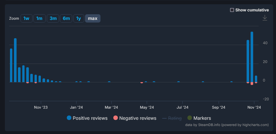 17 ноября 2023 года разработчик ожил. выпустил трейлер, поднял цену игры в полтора раза и заявил, что полностью переработал игру. неужели их собственный трейлер с 7к просмотрами стал той самой доминошкой, что даже релизные плюшки от стима смогли раскачать игру и вернуть её к жизни?
