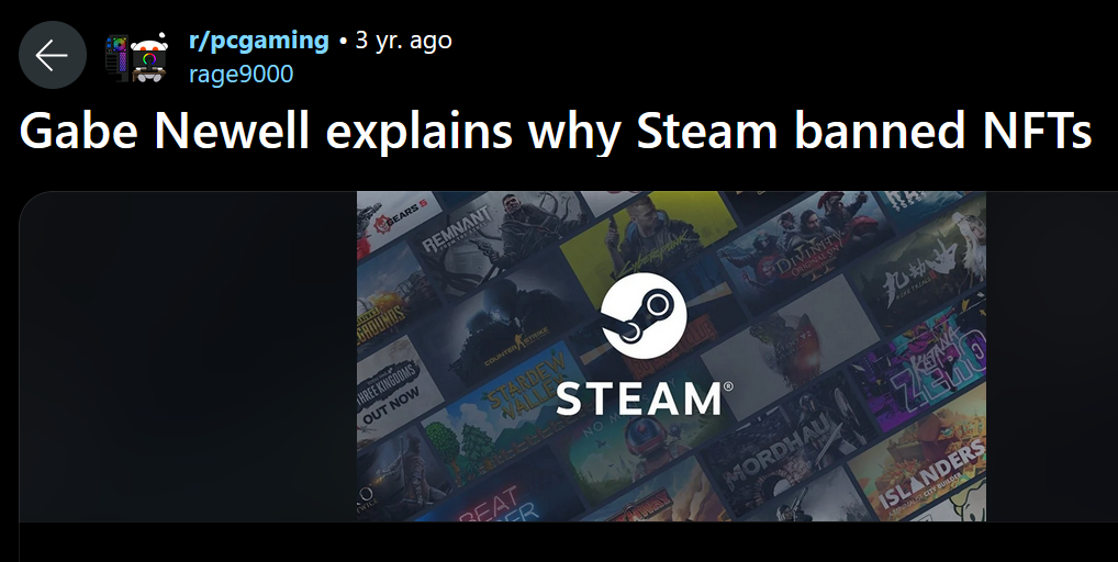 >>984272 понял, не знал об этом (не следил особо, т.к. не занимаюсь нфт). ты, конечно, охуенный пруф прилепил - заголовок поста говновасяна с говнореддита. но благо я нашел реальное подтверждение в партнерке стима: