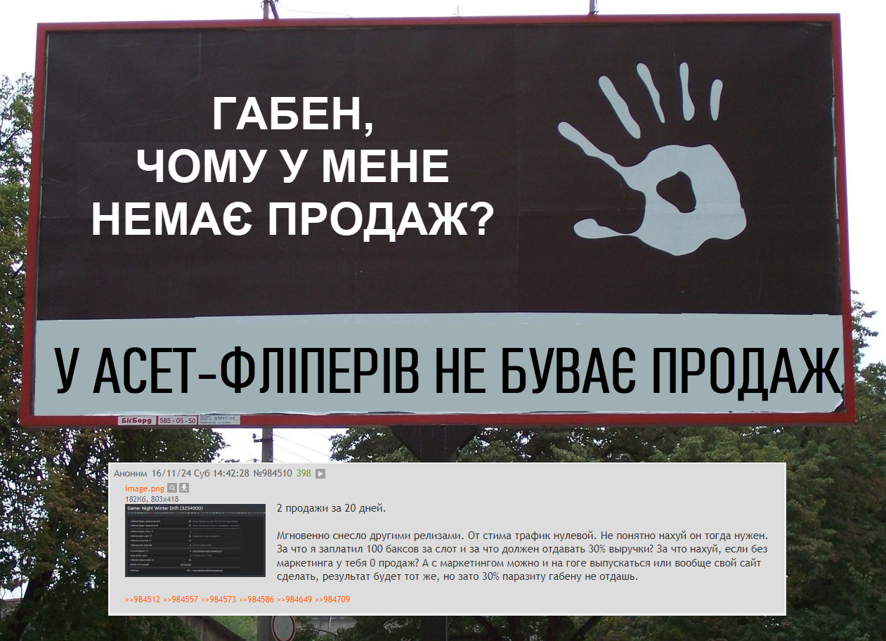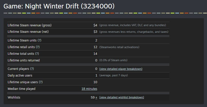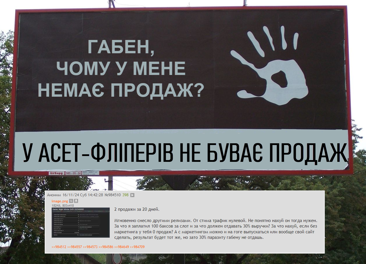 Мгновенно снесло другими релизами. От стима трафик нулевой. Не понятно нахуй он тогда нужен. За что я заплатил 100 баксов за слот и за что должен отдавать 30% выручки? За что нахуй, если без маркетинга у тебя 0 продаж? А с маркетингом можно и на гоге выпускаться или вообще свой сайт сделать, результат будет тот же, но зато 30% паразиту габену не отдашь.