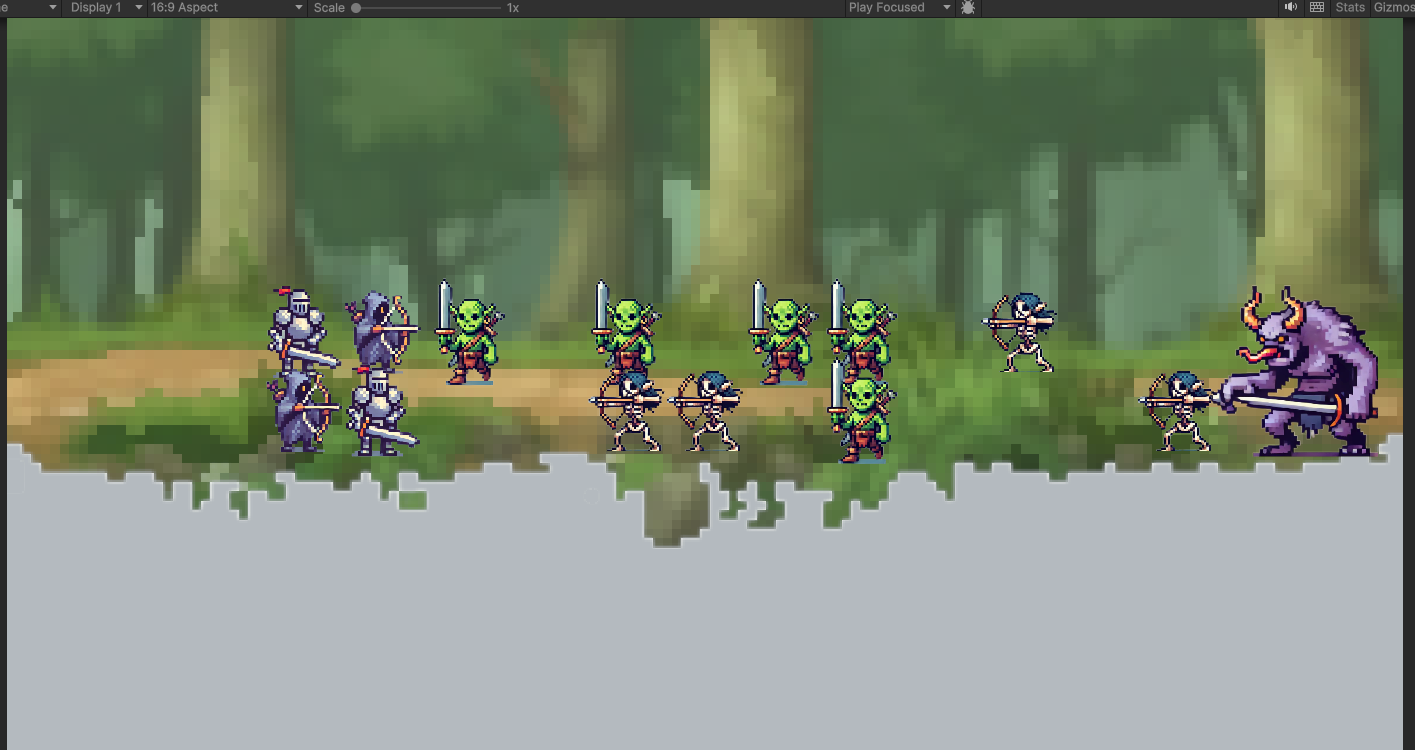 на другом что-то типа 2д-пошаговки, аля Даркест Данжен на минималках, где(в мечтах) ты набираешь/покупаешь отряд бойцов, идешь ими слева направо и месишь монстров автоатаками и скиллами (что тоже уже есть а прототипе, в тч с магией, аое-шками и саппорт-скиллами для юнитов-хилов и большими мобами в несколько клеток поля боя размером). в теории можно зашквариться тоннами рекламы и лутбоксами, сделав что-то типа гачи