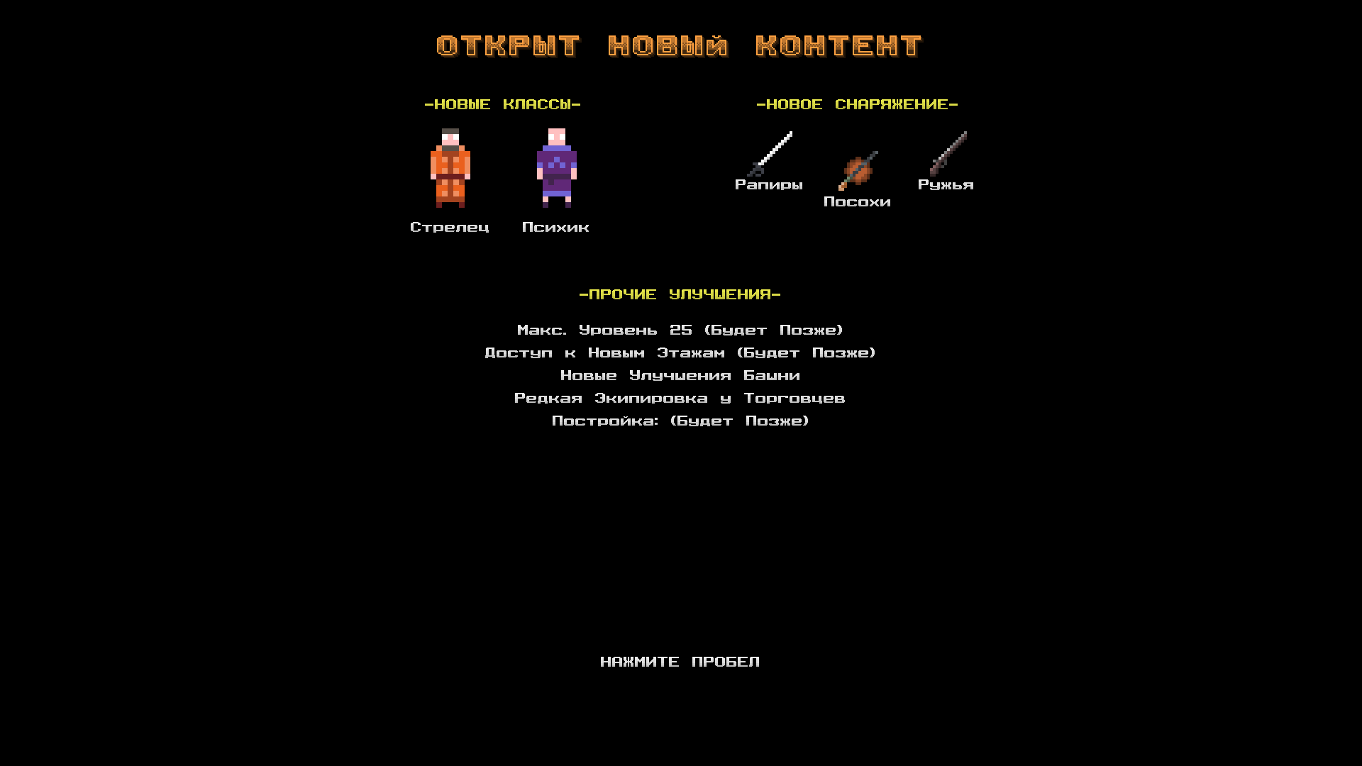 -Доделал основную часть нового 13-го этажа, добавил новый тип врагов Морозные Слизни (+Снежные Слизни); -Повышен максимальный уровень героя до 20, с этим добавлены новые предметы 20 уровня: снаряжение, еда и бинты; -Добавил апгрейды 3 тира для вторых умений каждого класса.