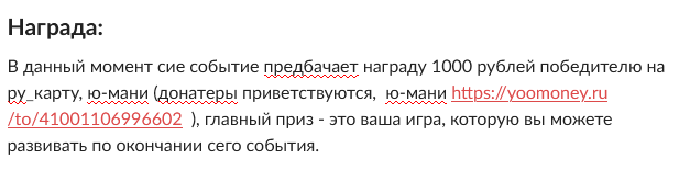 ПРИЗОВОЕ: 1700 руб на три места аутистам и одно место за ААА игру. 198 руб за блины, шаурму, клёцки, лепёшки в чайнике, тюрю, прочее нестандартное мучное, на выбор можно вставить в игру, ачивка лучшему добавлятору 50 руб за использование гнилозубых карликов 200 руб за самое первое место
