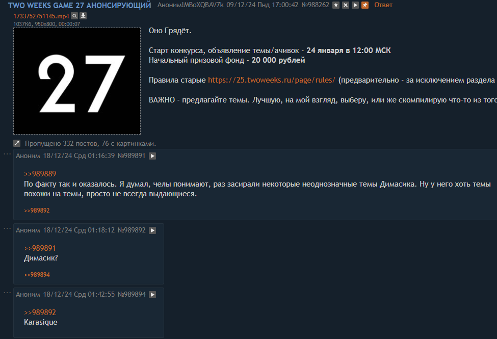 Эти слухи привели к большому падению рейтинга Димасика, и мидлы стали покидать ГД, но ТВГ пока для них не обесценилось. Димас ждал всю декабрьскую первую неделю и только улыбался в конфах, а когда почти стартануло ТДГ, он дал команду создать тред ТВГ, чтобы одновременно бомбануло у всех тэдэгайцев и Флешеслава.