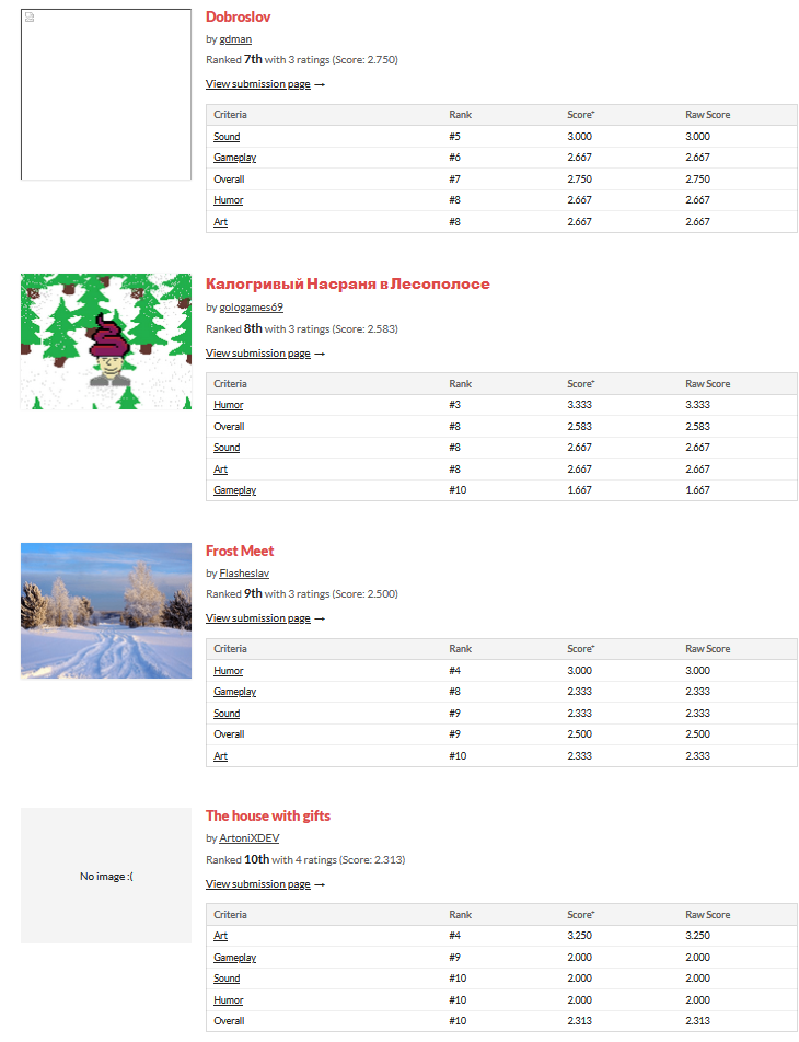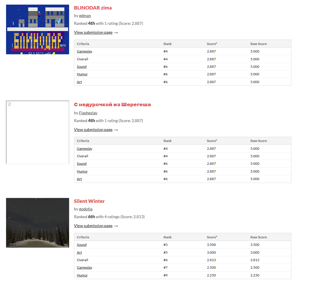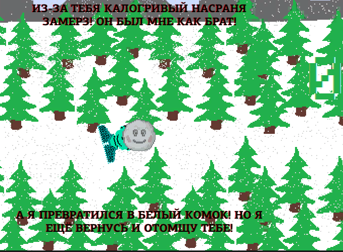 Я проголосовал, но коменты ич сожрал. Так что по памяти Лесополоса - клевый дизайн эффектов. Но разметка странно движется при езде, я даже не был уверен что поехал. Хотя вроде завелось. Жаль нельзя в деревья врезаться Рыба - в виртуалке пришлось запускать opengl, а там чет человечки не убивались. Я дошел до куда смог протискиваясь между вальсирующими монстрами. В визуально новельной части, сделай промотку текста, а не его скип. Чтобы сразу все предложение до конца выводилось. Ледоруб - приятно, что позаботился об игроке, и есть автокопание. Атмосферно, но ходить надоедает. С другой стороны а как еще показать атмосферность. Можно вьюгу добавить и чтоб толкала. В дверь трудно попасть, вроде подсвечена вся, а работает ручка. Хотелось пообследовать мир по бокам, думал что будет что-то с деревом. Шаманизм в конце не смог расшифровать. Че там еще было. А, насраня мое почтение, такое созвездие твгшек. Достойное использование вычислительных мощностей. Недурочку не смог перепрыгнуть сугробы.