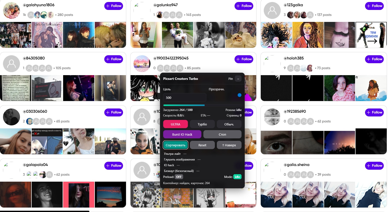 Без лишних слов: я написал скрипт для PicsArt, который автоматически прокручивает ленту и сортирует карточки по количеству постов. Сделал это для удобного поиска интересного контента и делюсь с вами, чтобы вместе находить что-то стоящее.