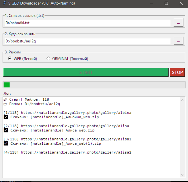 скачиваем VIGBO_Downloader.exe 1. создаем текстовый файл с ссылкой/ссылками на скачивание и 2. выбираем его в программе 3. выбираем куда скачивать 4. выбираем размер фоток PROFIT