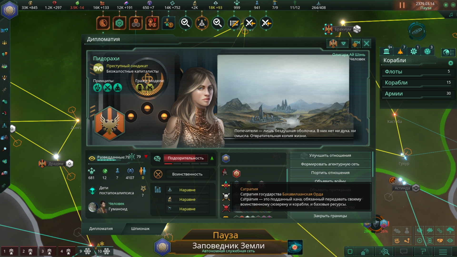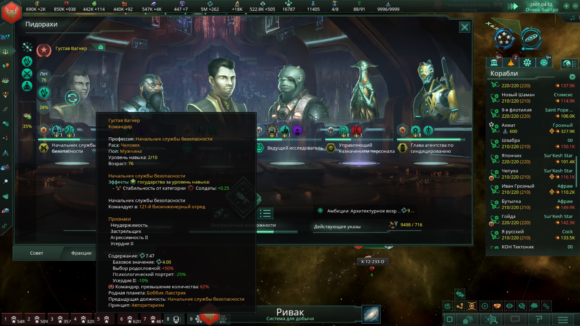 Авторитаризм, Милитаризм, Спиритуализм. Без фанатичных черт, потому-что сидение на всех стульях это наша скрепа и суть любой политики. И вообще сидящий у границы пожирающий чуркорой давно пора исключить из списка запрещенных на Терре кризисов Цивики на криминальный синдикат и чвк действительно идеально вписываются при отыгрыше за Россиюшку в космосе Флот через ракетные крейсера и торпеды А из трейтов бери услужливые и аграрии, чтобы яблоки с Марса быстрее фармить. А то хули ты как этот