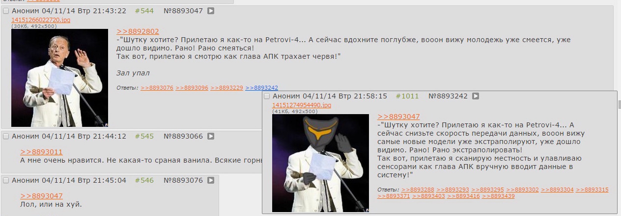 >>1274035 Какой всё-таки душевный был период Петровича, словами не описать. Настоящее помешательство анона с массовым излиянием души. Неспроста говорят, что отечественного анона хлебом не корми, уиии!й в космос глядеть. Советская закалка, что уж тут.