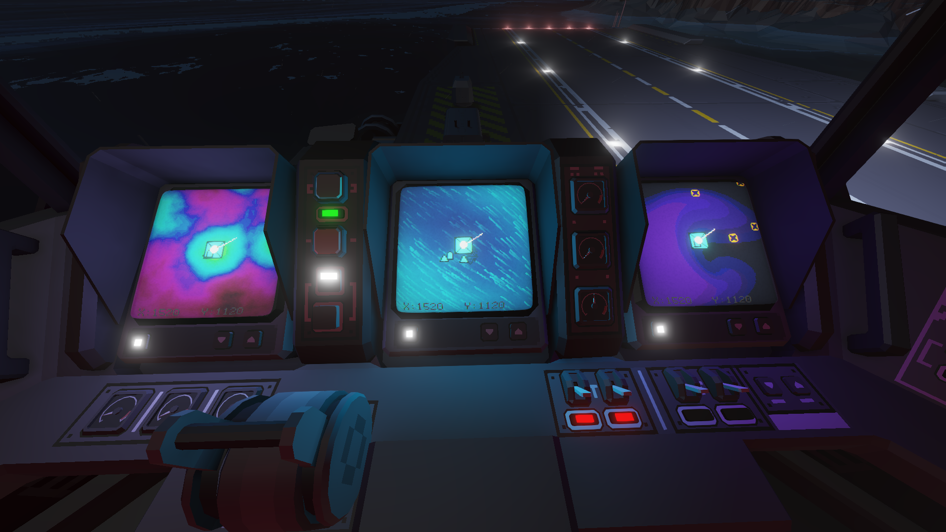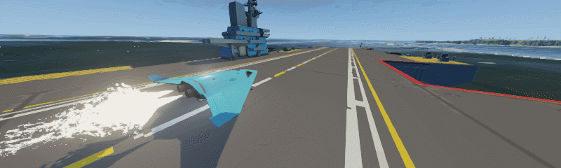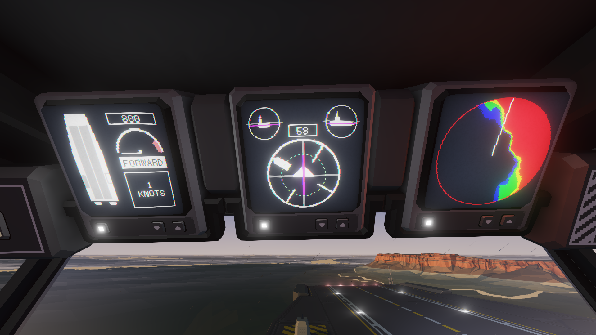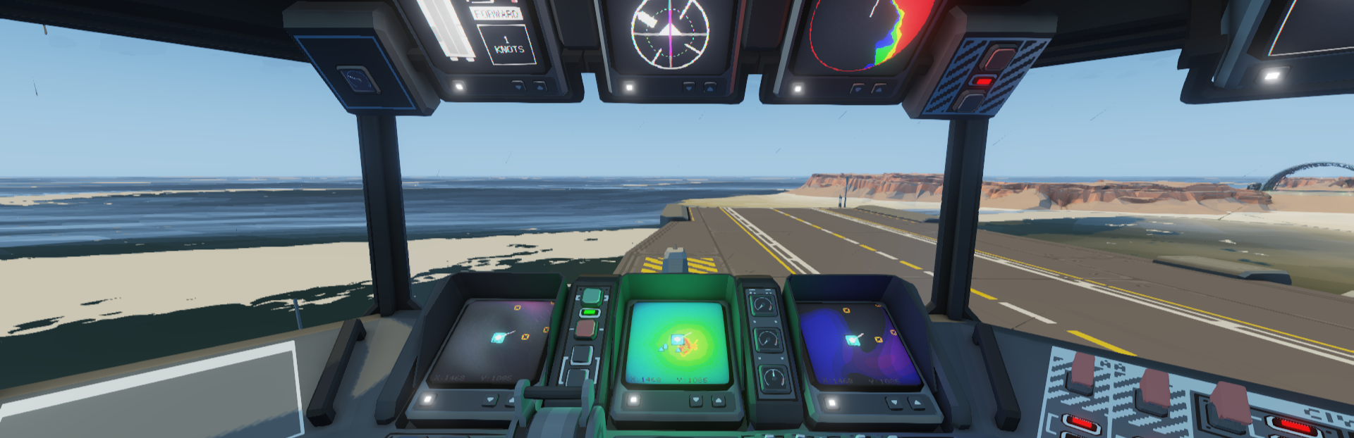 The carrier ocean floor sonar works in a similar way to real sonar, scanning the ocean floor in a sweeping pattern, and mapping the returned data to a visual graph showing the proximity of the ocean floor in all directions. This system is entirely mechanical, using the physics simulation to test and simulate the sonar system.