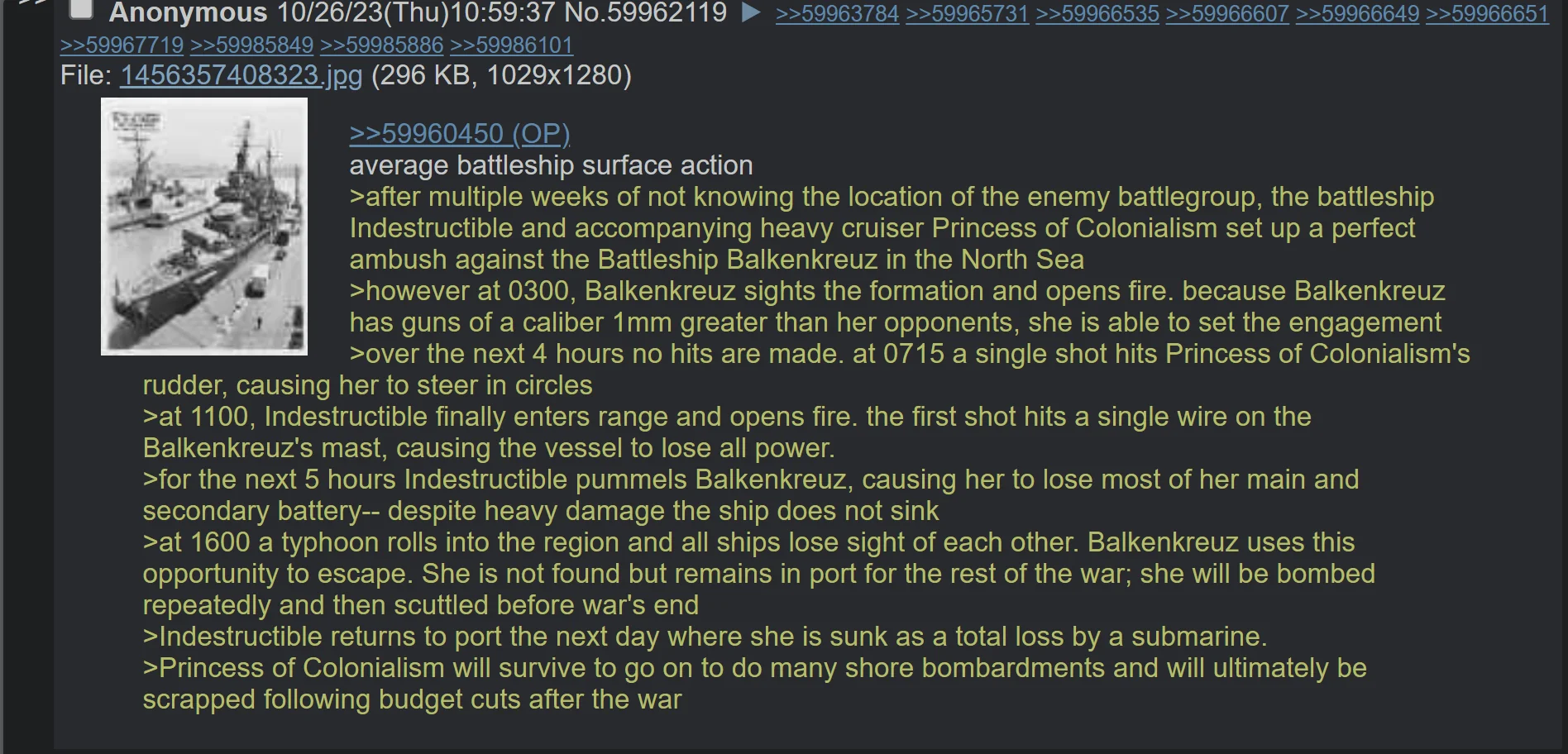 Накатил эти ваши дредноуты. С альфы не трогал, даже отправленный мне ключ для стимверсии год игнорил. Собсна, такие йобы, как в альфе, уже не собираются, конечно, но с балансом все еще нипанятна. Начал за дефолтную Гермаху 1910 самое удобное расположение, чтобы потрогать кампанию, не распыляясь на полземли. Долго колупал линкорные корпуса в редакторе, а в итоге самой эффективной йобой у мемчиков оказался даже не самый здоровый линейный крейсер, ибо при сопоставимом с линкорами вооружении и бронировании, топит 31 узел, ничего не боится, силен, смел и вообще. Так и живу его модернизациями уже 6 лет, абсолютно не понимая, зачем мне перекатываться на более крупные лохани, где получив немножко больше пушек, я потеряю узлов 6-7, а значит и возможность съебаться в любой непонятной ситуации. В итоге весь кайзеровский линейный флот состоит на 100% из BC, а BB видит только на картинках и у врага.