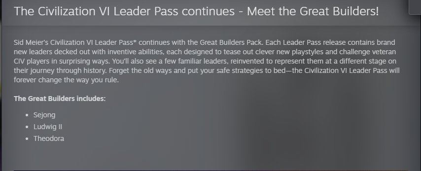>>1279185 Я иногда подумываю длц к шестой циве как-нибудь купить, но она залочена в моём регионе, а пиратить или искать обходные пути покупки мне лень, когда есть куча непоигранных игр на аккаунтах.