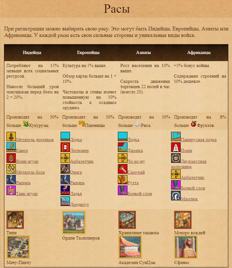 У каждой расы свои фишки, некоторым доступна стройка только своего Чуда Света (да чудеса света тут есть как и в Циве), есть юниты и техника, которая не доступна другим расам, также каждая раса специлизируется на своей растишке - белые лучше добывают пшеницу, азиаты рис, индейцы кукурузу, негры фрукты.